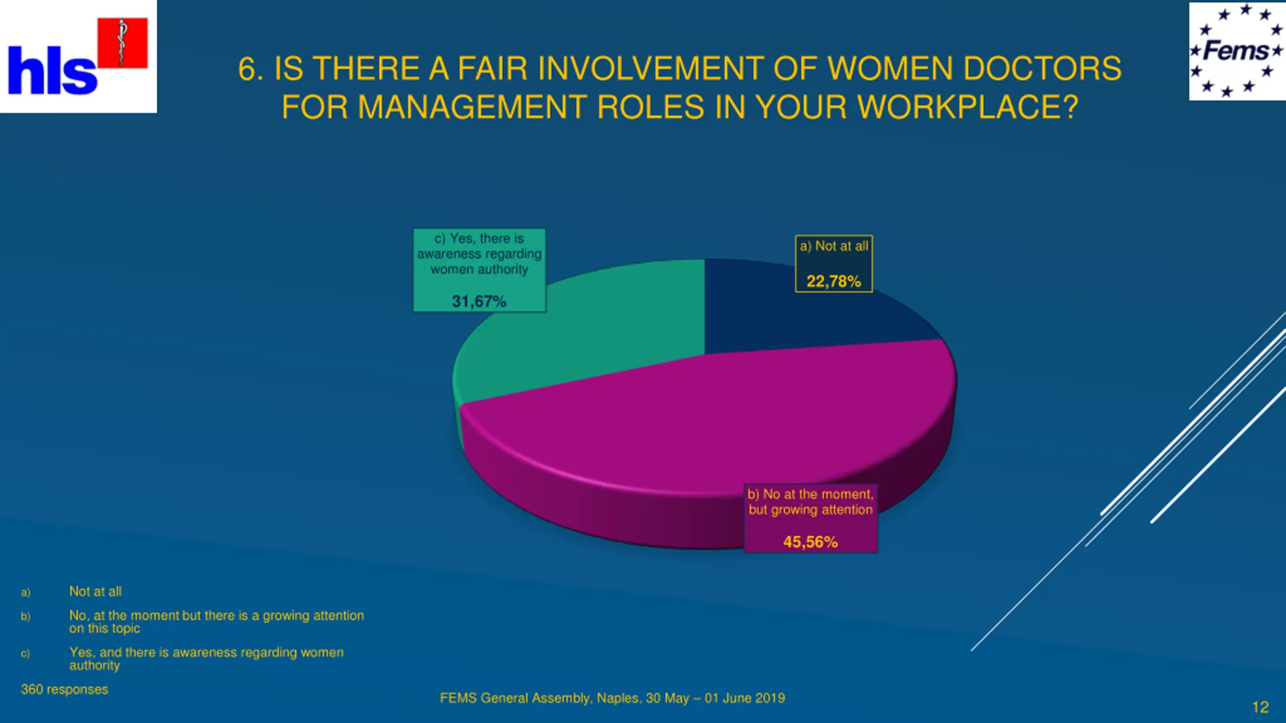 6. IS THERE A FAIR INVOLVEMENT OF WOMEN DOCTORS FOR MANAGEMENT ROLES IN YOUR WORKPLACE? c) Yes, there is awareness regarding women authority a) Not at all 22,78% 31,67% b) No at the moment, but growing attention 45,56% Not at all a) No, at the moment but there is a growing attention on this topic b) Yes, and there is awareness regarding women authority c) 360 responses FEMS General Assembly, Naples, 30 May 01 June 2019 12