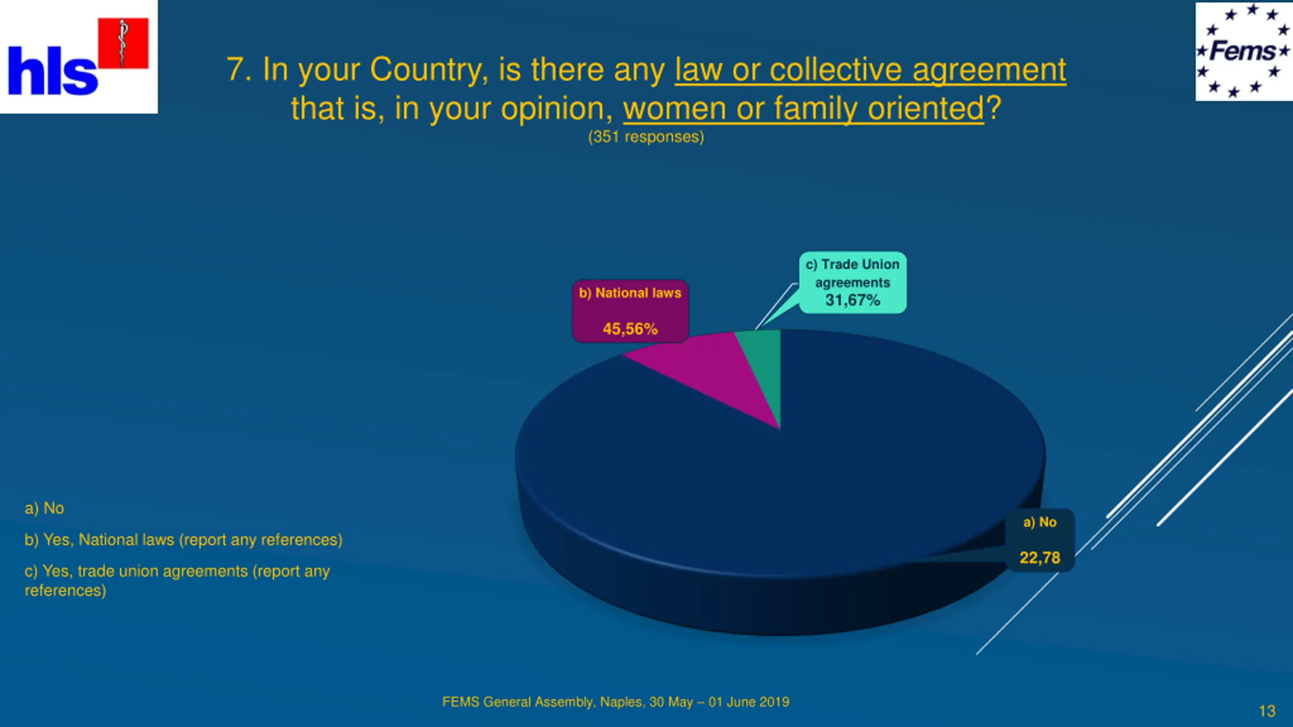 7. In your Country, is there any law or collective agreement that is, in your opinion, women or family oriented? (351 responses) c) Trade Union agreements 31,67% b) National laws 45,56% a) No a) No b) Yes, National laws (report any references) 22,78 c) Yes, trade union agreements (report any references) FEMS General Assembly, Naples, 30 May 01 June 2019 13