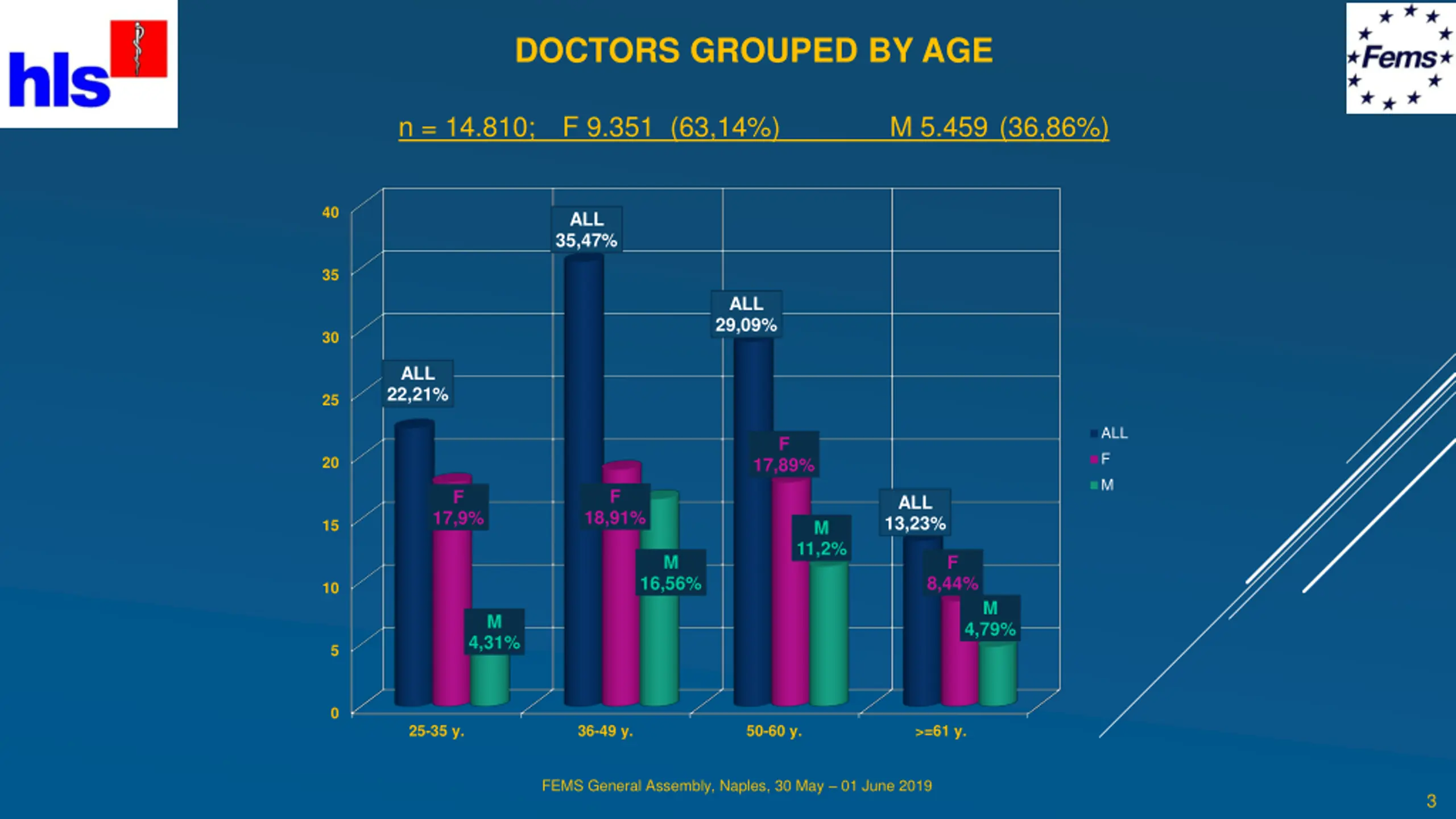 DOCTORS GROUPED BY AGE n = 14.810; F 9.351 (63,14%) M 5.459 (36,86%) 40 ALL 35,47% 35 ALL 29,09% 30 ALL 22,21% 25 ALL F F 20 17,89% M F F ALL 13,23% 18,91% 17,9% 15 M 11,2% M F 16,56% 8,44% 10 M M 4,79% 4,31% 5 0 25-35 y. 36-49 y. 50-60 y. >=61 y. FEMS General Assembly, Naples, 30 May 01 June 2019 3