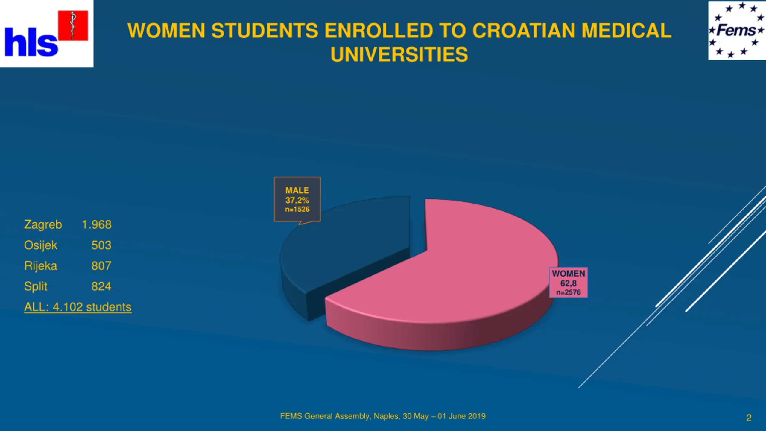 WOMEN STUDENTS ENROLLED TO CROATIAN MEDICAL UNIVERSITIES MALE 37,2% n=1526 Zagreb 1.968 Osijek 503 Rijeka 807 WOMEN 62,8 n=2576 Split 824 ALL: 4.102 students FEMS General Assembly, Naples, 30 May 01 June 2019 2