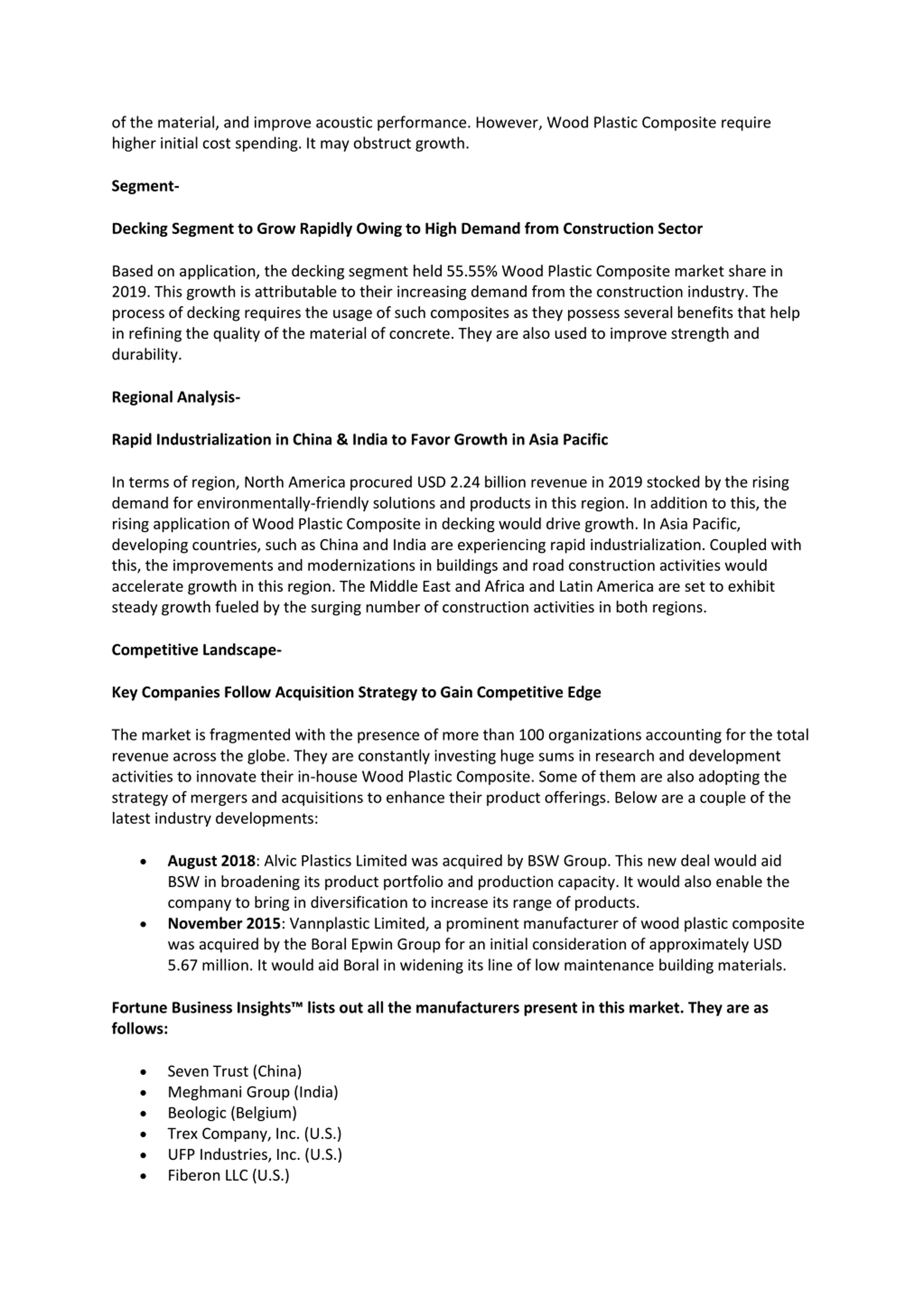 of the material, and improve acoustic performance. However, Wood Plastic Composite require higher initial cost spending. It may obstruct growth. Segment- Decking Segment to Grow Rapidly Owing to High Demand from Construction Sector Based on application, the decking segment held 55.55% Wood Plastic Composite market share in 2019. This growth is attributable to their increasing demand from the construction industry. The process of decking requires the usage of such composites as they possess several benefits that help in refining the quality of the material of concrete. They are also used to improve strength and durability. Regional Analysis- Rapid Industrialization in China & India to Favor Growth in Asia Pacific In terms of region, North America procured USD 2.24 billion revenue in 2019 stocked by the rising demand for environmentally-friendly solutions and products in this region. In addition to this, the rising application of Wood Plastic Composite in decking would drive growth. In Asia Pacific, developing countries, such as China and India are experiencing rapid industrialization. Coupled with this, the improvements and modernizations in buildings and road construction activities would accelerate growth in this region. The Middle East and Africa and Latin America are set to exhibit steady growth fueled by the surging number of construction activities in both regions. Competitive Landscape- Key Companies Follow Acquisition Strategy to Gain Competitive Edge The market is fragmented with the presence of more than 100 organizations accounting for the total revenue across the globe. They are constantly investing huge sums in research and development activities to innovate their in-house Wood Plastic Composite. Some of them are also adopting the strategy of mergers and acquisitions to enhance their product offerings. Below are a couple of the latest industry developments: August 2018: Alvic Plastics Limited was acquired by BSW Group. This new deal would aid BSW in broadening its product portfolio and production capacity. It would also enable the company to bring in diversification to increase its range of products. November 2015: Vannplastic Limited, a prominent manufacturer of wood plastic composite was acquired by the Boral Epwin Group for an initial consideration of approximately USD 5.67 million. It would aid Boral in widening its line of low maintenance building materials. Fortune Business Insights lists out all the manufacturers present in this market. They are as follows: Seven Trust (China) Meghmani Group (India) Beologic (Belgium) Trex Company, Inc. (U.S.) UFP Industries, Inc. (U.S.) Fiberon LLC (U.S.)
