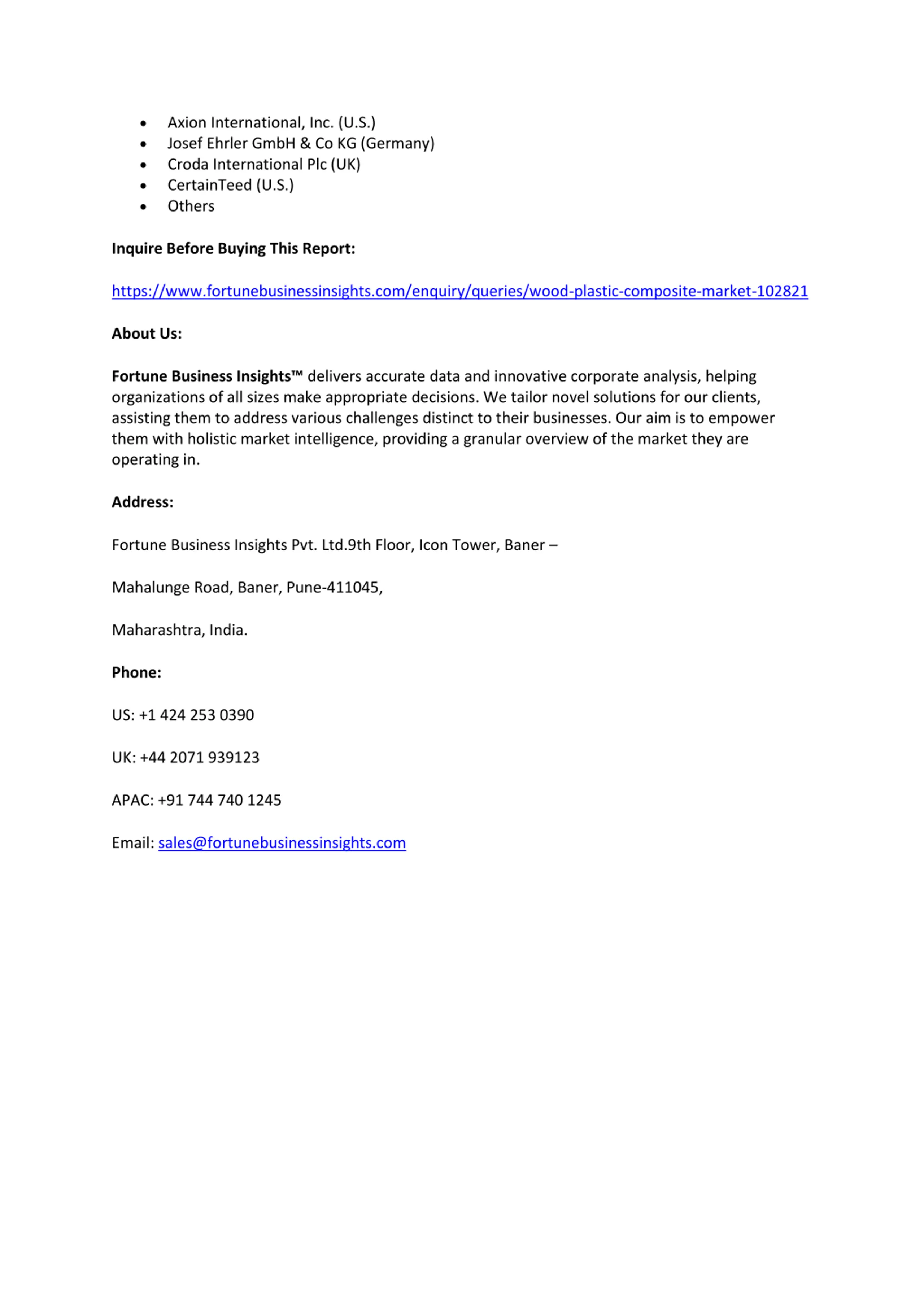 Axion International, Inc. (U.S.) Josef Ehrler GmbH & Co KG (Germany) Croda International Plc (UK) CertainTeed (U.S.) Others Inquire Before Buying This Report: https://www.fortunebusinessinsights.com/enquiry/queries/wood-plastic-composite-market-102821 About Us: Fortune Business Insights delivers accurate data and innovative corporate analysis, helping organizations of all sizes make appropriate decisions. We tailor novel solutions for our clients, assisting them to address various challenges distinct to their businesses. Our aim is to empower them with holistic market intelligence, providing a granular overview of the market they are operating in. Address: Fortune Business Insights Pvt. Ltd.9th Floor, Icon Tower, Baner Mahalunge Road, Baner, Pune-411045, Maharashtra, India. Phone: US: +1 424 253 0390 UK: +44 2071 939123 APAC: +91 744 740 1245 Email: sales@fortunebusinessinsights.com