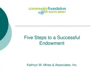 Specific Funds Scholarships Operations Formed to Endow Scholarship. Scholarships for graduating seniors from the Woodland Joint Unified School District. Criteria = Academic Excellence = Valedictorian Award = $6,000 disbursed (generally) over a four year period in increments based upon academic program followed i.e. Semester or Quarter system. Required reporting of student regarding achievement and current enrollment. Current Position and Target The Target was to build the scholarship endowment to a point at which it s own earning will sustain the scholarship disbursements and maintain inflationary growth. Scholarship Distributions = $12,000, given a 2.5% distribution rate the fund will require $480,000 to reach the target. Current balance is approximately $476,000 in the scholarship endowment s investment account.