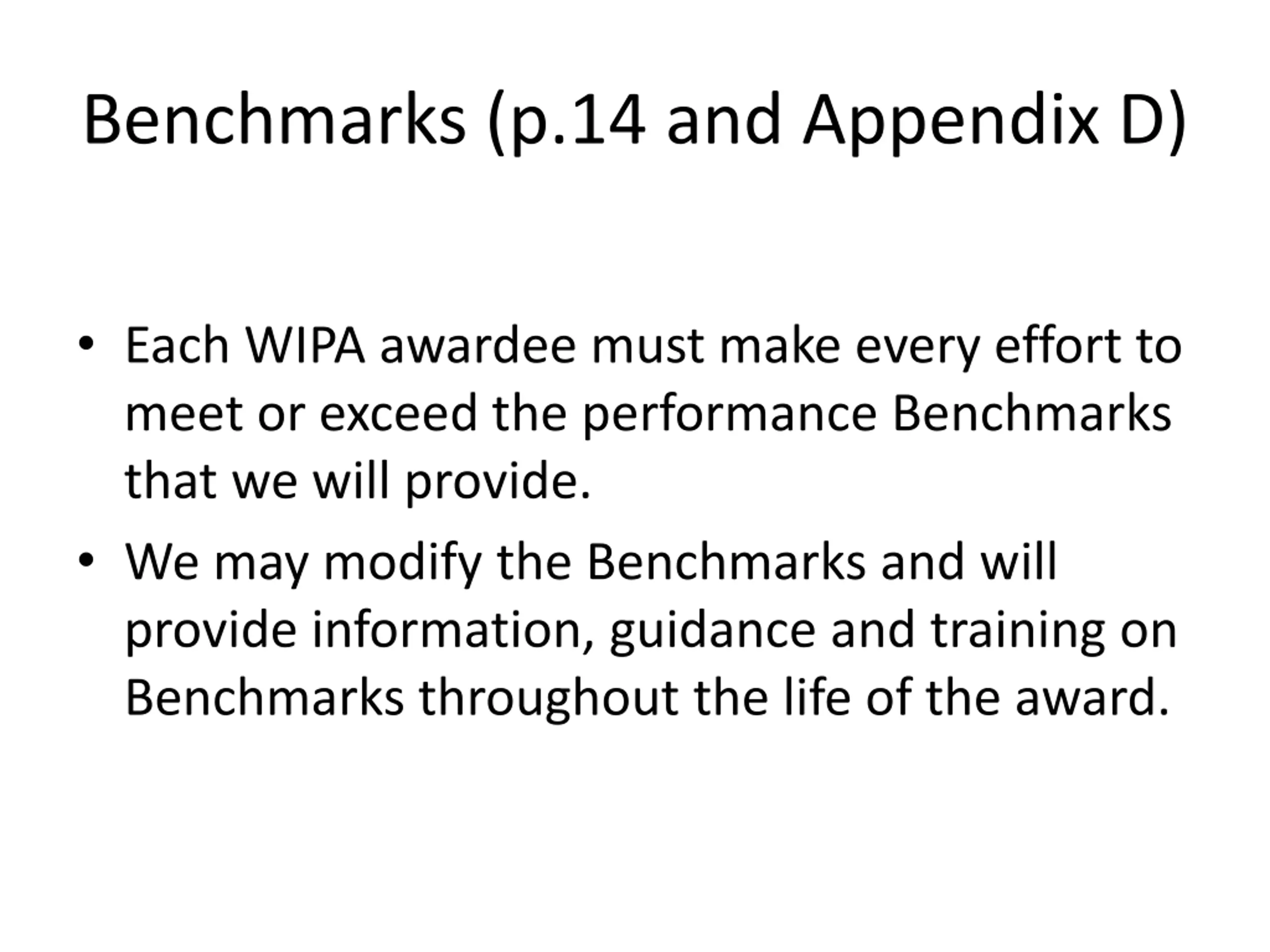 Benchmarks (p.14 and Appendix D) Each WIPA awardee must make every effort to meet or exceed the performance Benchmarks that we will provide. We may modify the Benchmarks and will provide information, guidance and training on Benchmarks throughout the life of the award.