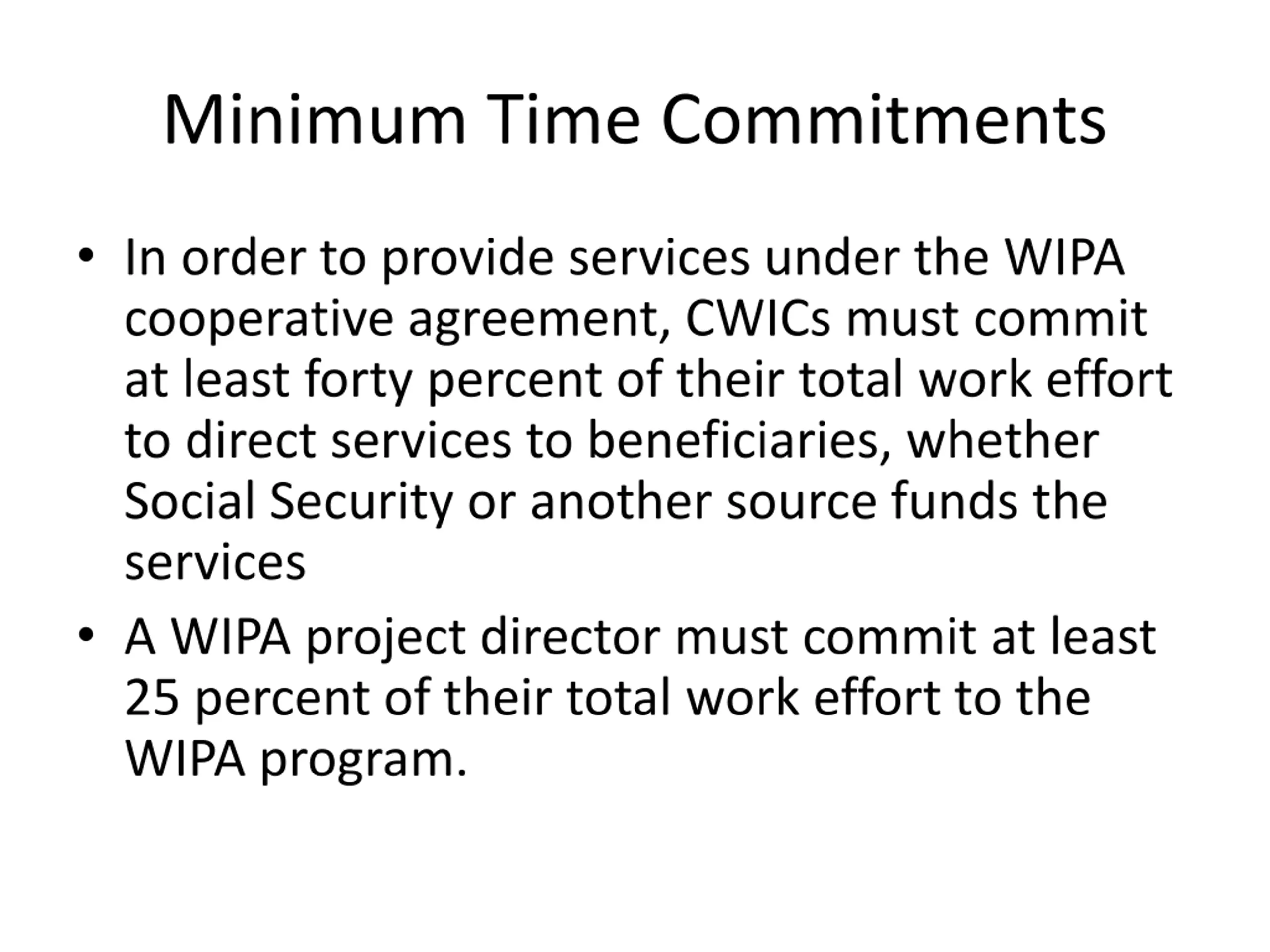 Minimum Time Commitments In order to provide services under the WIPA cooperative agreement, CWICs must commit at least forty percent of their total work effort to direct services to beneficiaries, whether Social Security or another source funds the services A WIPA project director must commit at least 25 percent of their total work effort to the WIPA program.