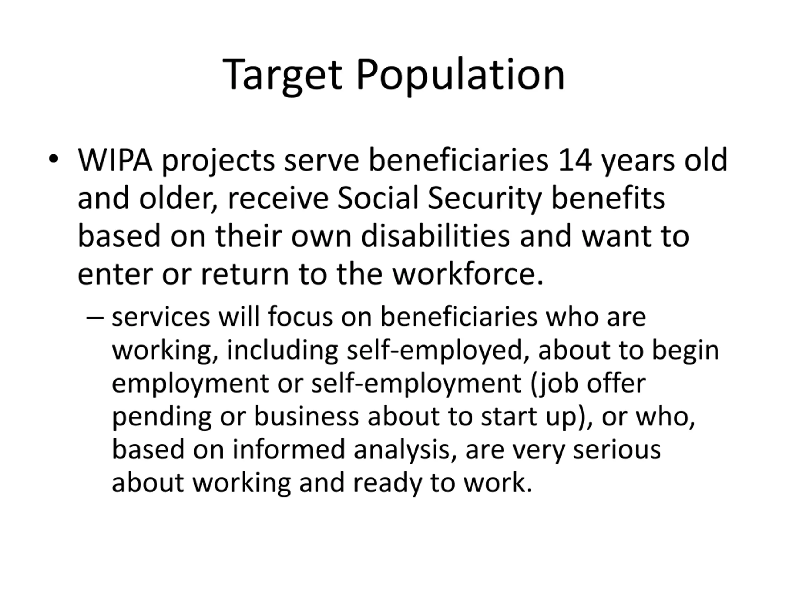 Target Population WIPA projects serve beneficiaries 14 years old and older, receive Social Security benefits based on their own disabilities and want to enter or return to the workforce. services will focus on beneficiaries who are working, including self-employed, about to begin employment or self-employment (job offer pending or business about to start up), or who, based on informed analysis, are very serious about working and ready to work.