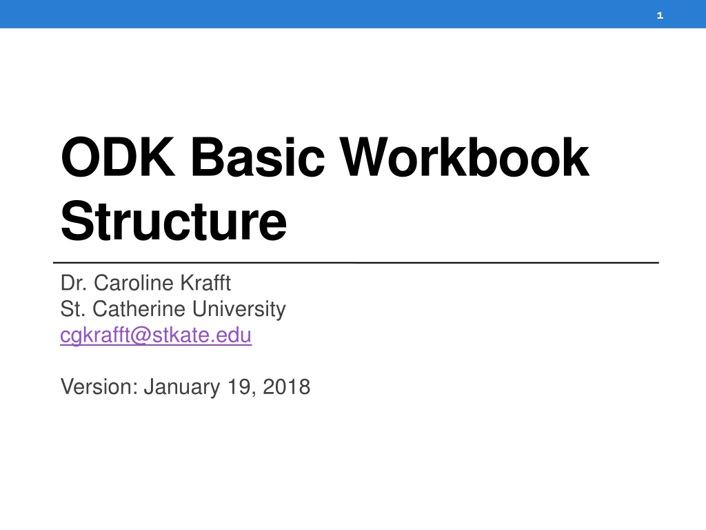 1 ODK Basic Workbook Structure Dr. Caroline Krafft St. Catherine University cgkrafft@stkate.edu Version: January 19, 2018