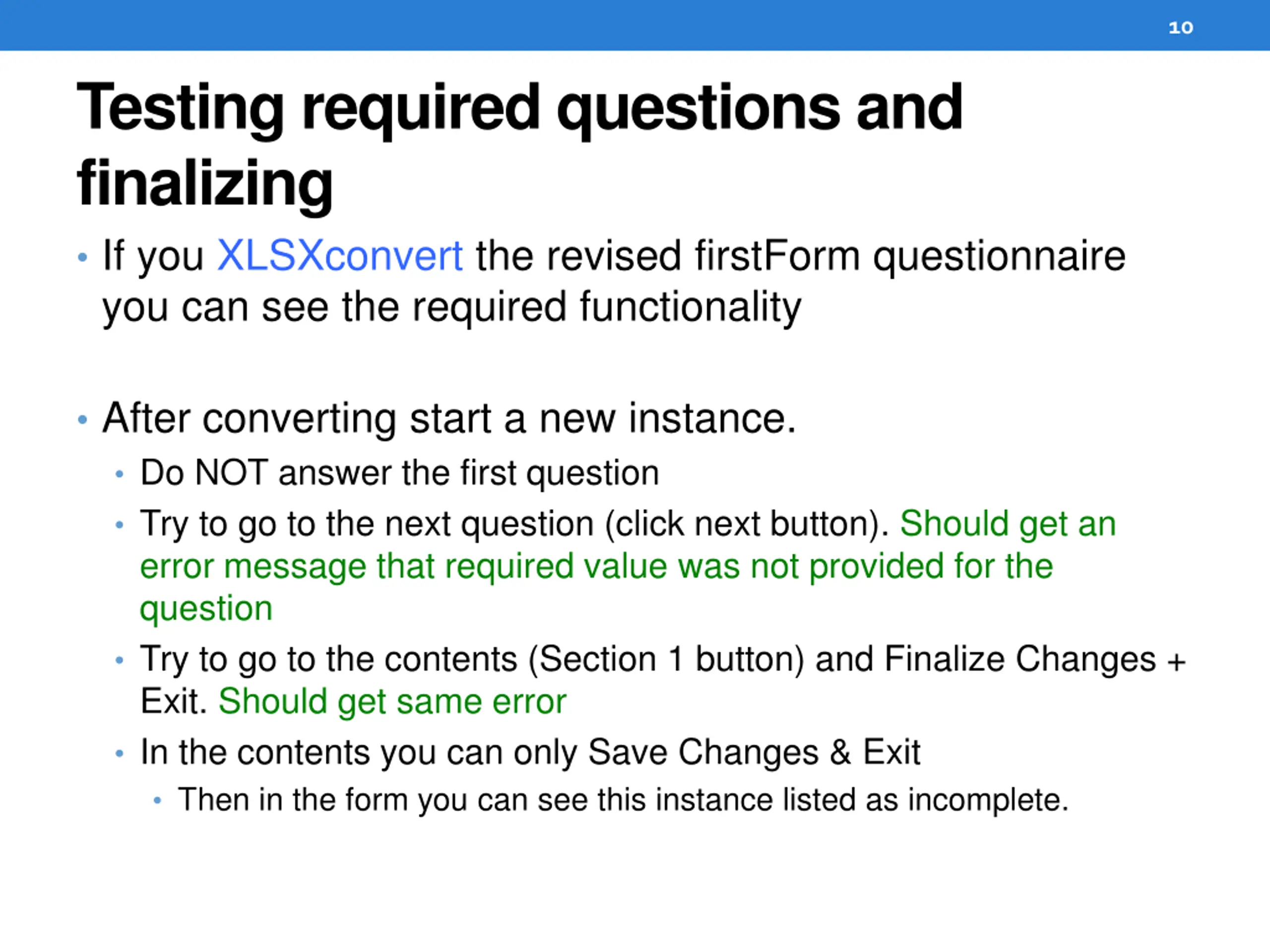 10 Testing required questions and finalizing If you XLSXconvert the revised firstForm questionnaire you can see the required functionality After converting start a new instance. Do NOT answer the first question Try to go to the next question (click next button). Should get an error message that required value was not provided for the question Try to go to the contents (Section 1 button) and Finalize Changes + Exit. Should get same error In the contents you can only Save Changes & Exit Then in the form you can see this instance listed as incomplete.