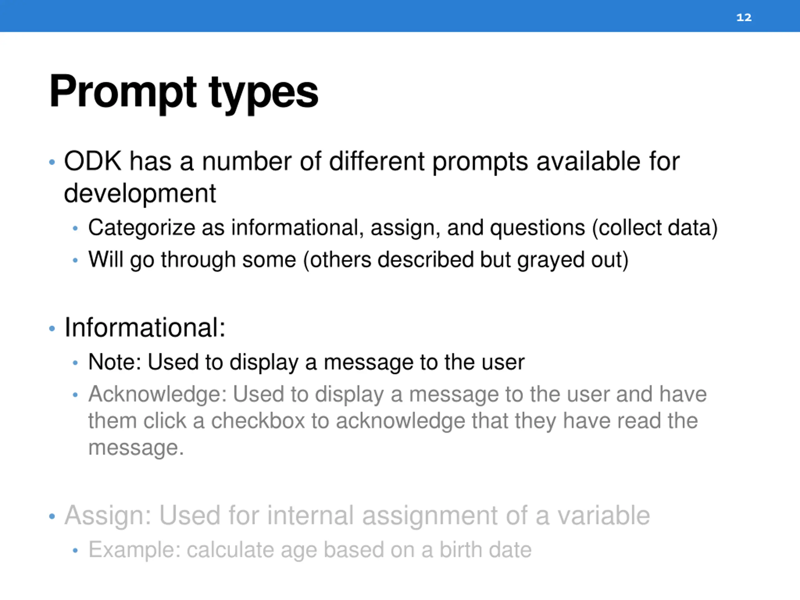 12 Prompt types ODK has a number of different prompts available for development Categorize as informational, assign, and questions (collect data) Will go through some (others described but grayed out) Informational: Note: Used to display a message to the user Acknowledge: Used to display a message to the user and have them click a checkbox to acknowledge that they have read the message. Assign: Used for internal assignment of a variable Example: calculate age based on a birth date
