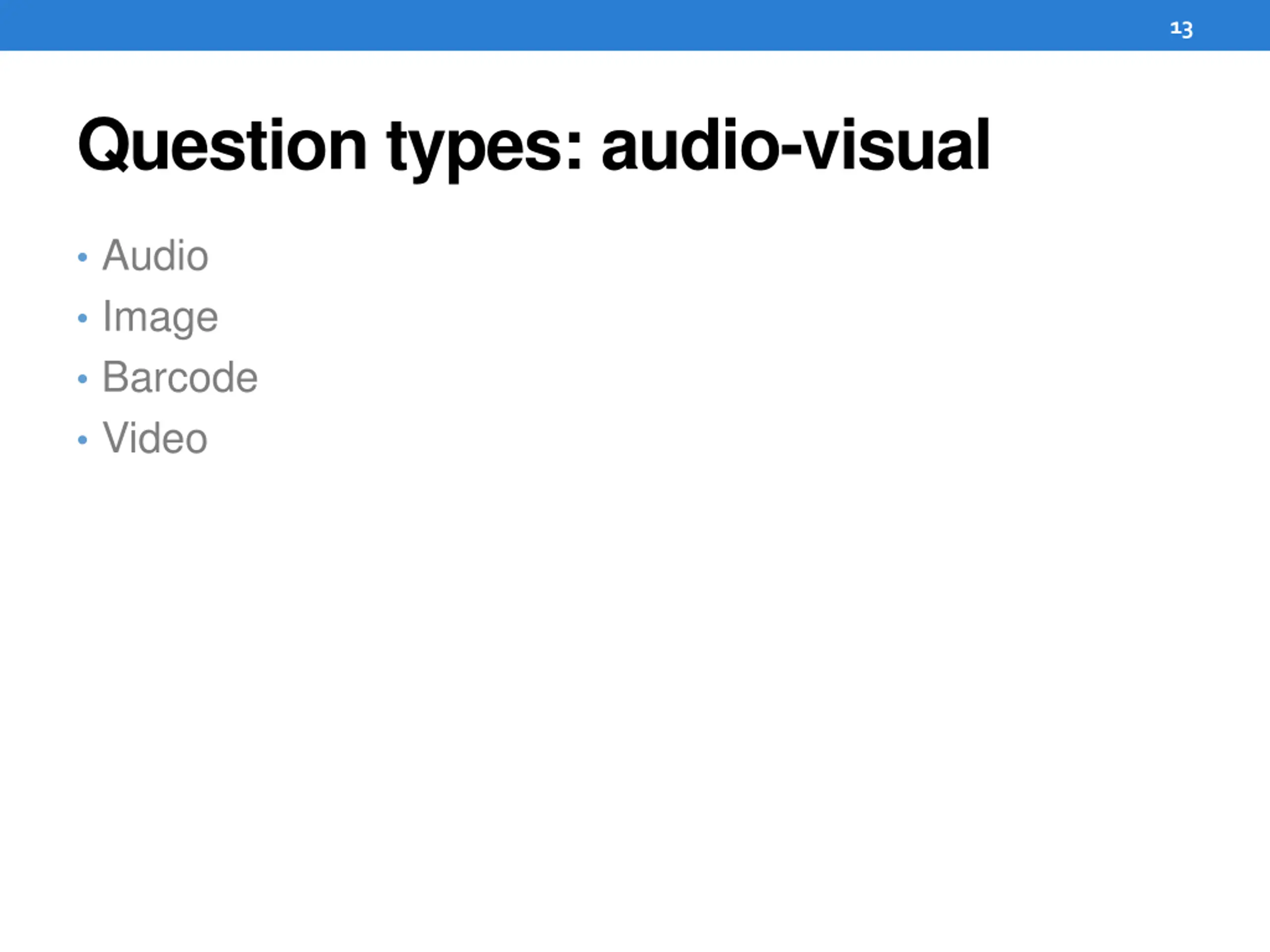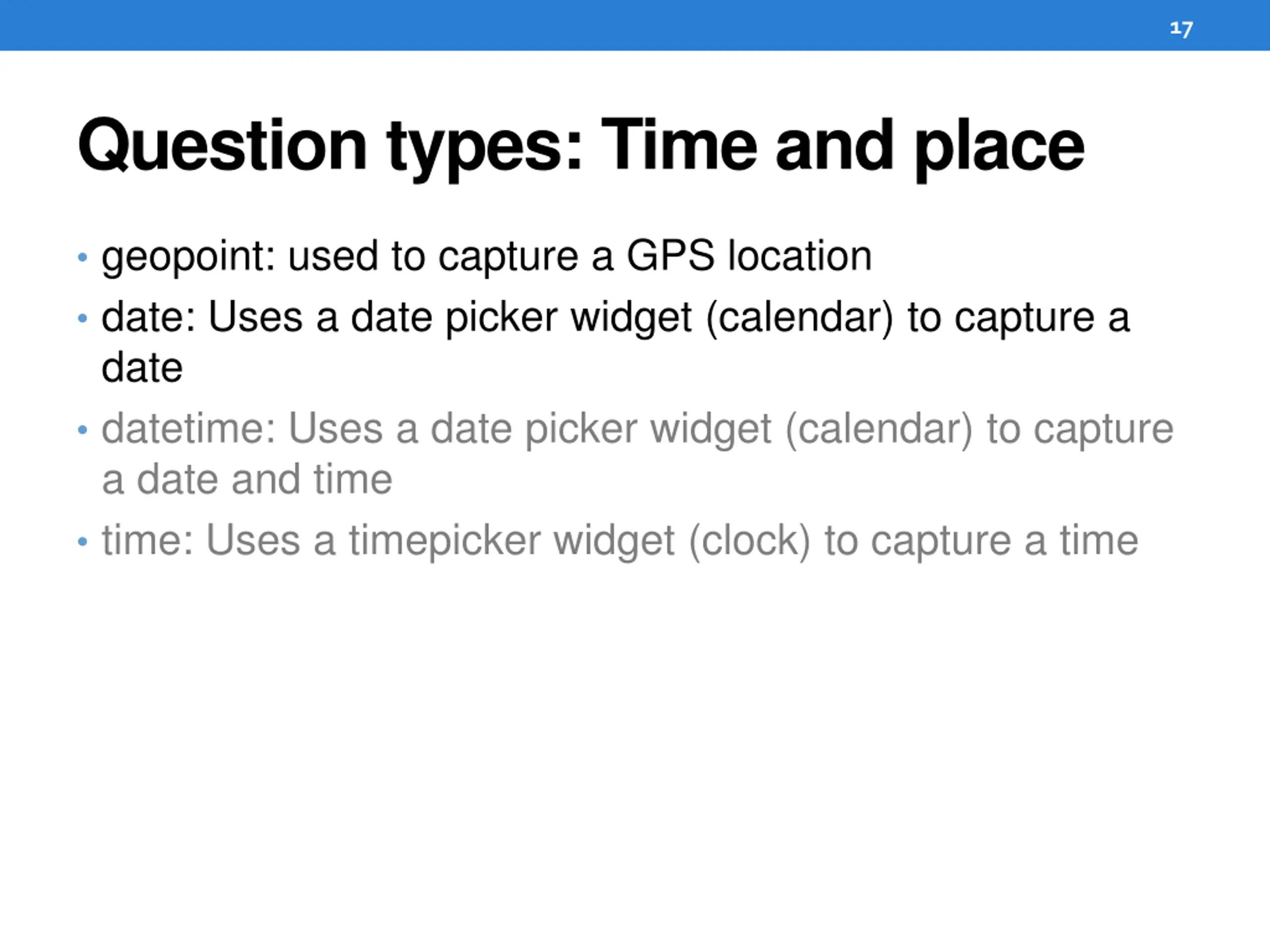 17 Question types: Time and place geopoint: used to capture a GPS location date: Uses a date picker widget (calendar) to capture a date datetime: Uses a date picker widget (calendar) to capture a date and time time: Uses a timepicker widget (clock) to capture a time