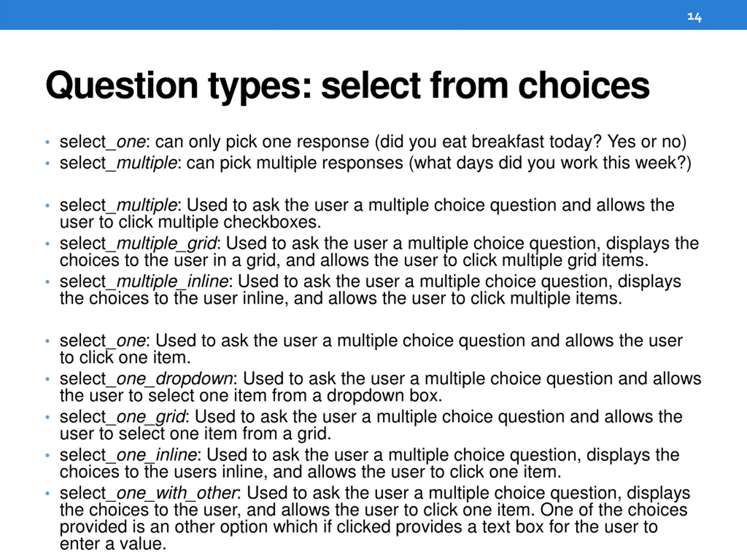 14 Question types: select from choices select_one: can only pick one response (did you eat breakfast today? Yes or no) select_multiple: can pick multiple responses (what days did you work this week?) select_multiple: Used to ask the user a multiple choice question and allows the user to click multiple checkboxes. select_multiple_grid: Used to ask the user a multiple choice question, displays the choices to the user in a grid, and allows the user to click multiple grid items. select_multiple_inline: Used to ask the user a multiple choice question, displays the choices to the user inline, and allows the user to click multiple items. select_one: Used to ask the user a multiple choice question and allows the user to click one item. select_one_dropdown: Used to ask the user a multiple choice question and allows the user to select one item from a dropdown box. select_one_grid: Used to ask the user a multiple choice question and allows the user to select one item from a grid. select_one_inline: Used to ask the user a multiple choice question, displays the choices to the users inline, and allows the user to click one item. select_one_with_other: Used to ask the user a multiple choice question, displays the choices to the user, and allows the user to click one item. One of the choices provided is an other option which if clicked provides a text box for the user to enter a value.