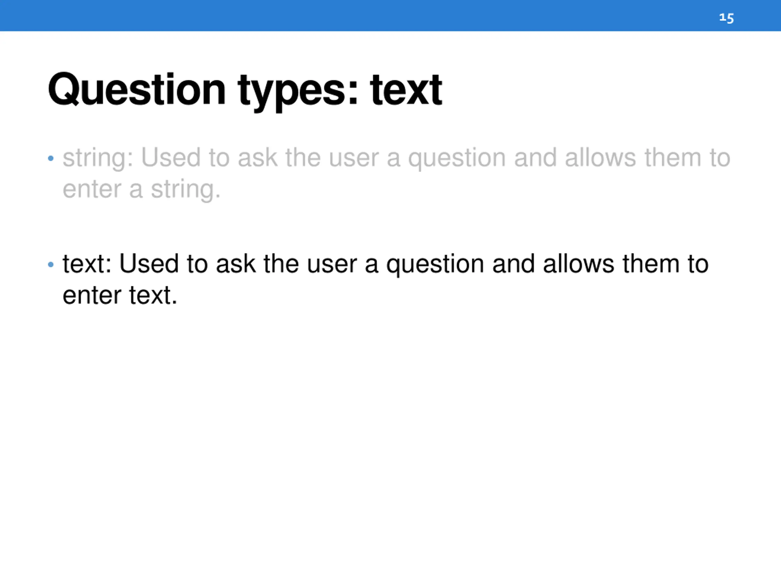 15 Question types: text string: Used to ask the user a question and allows them to enter a string. text: Used to ask the user a question and allows them to enter text.