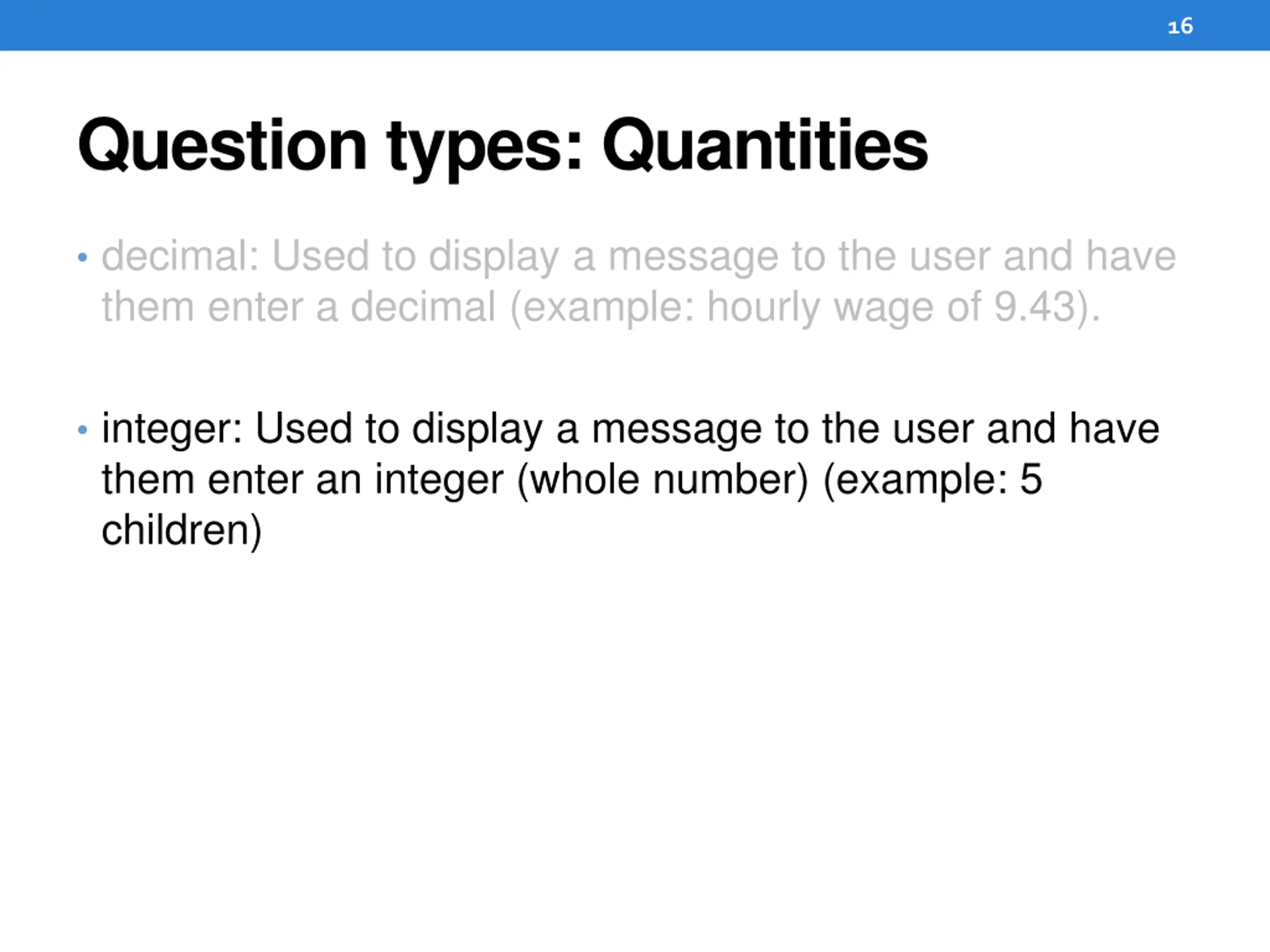 16 Question types: Quantities decimal: Used to display a message to the user and have them enter a decimal (example: hourly wage of 9.43). integer: Used to display a message to the user and have them enter an integer (whole number) (example: 5 children)