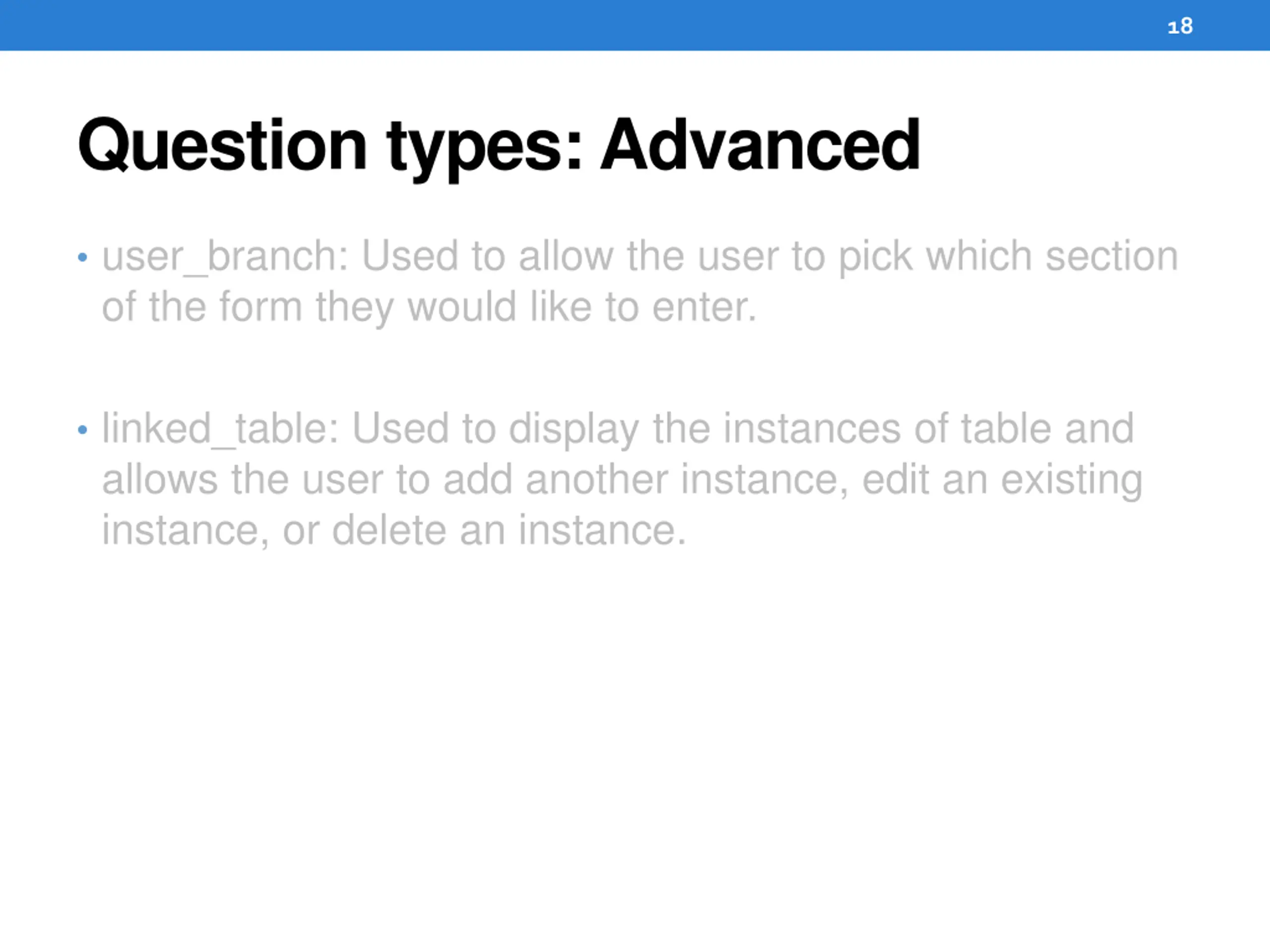18 Question types: Advanced user_branch: Used to allow the user to pick which section of the form they would like to enter. linked_table: Used to display the instances of table and allows the user to add another instance, edit an existing instance, or delete an instance.