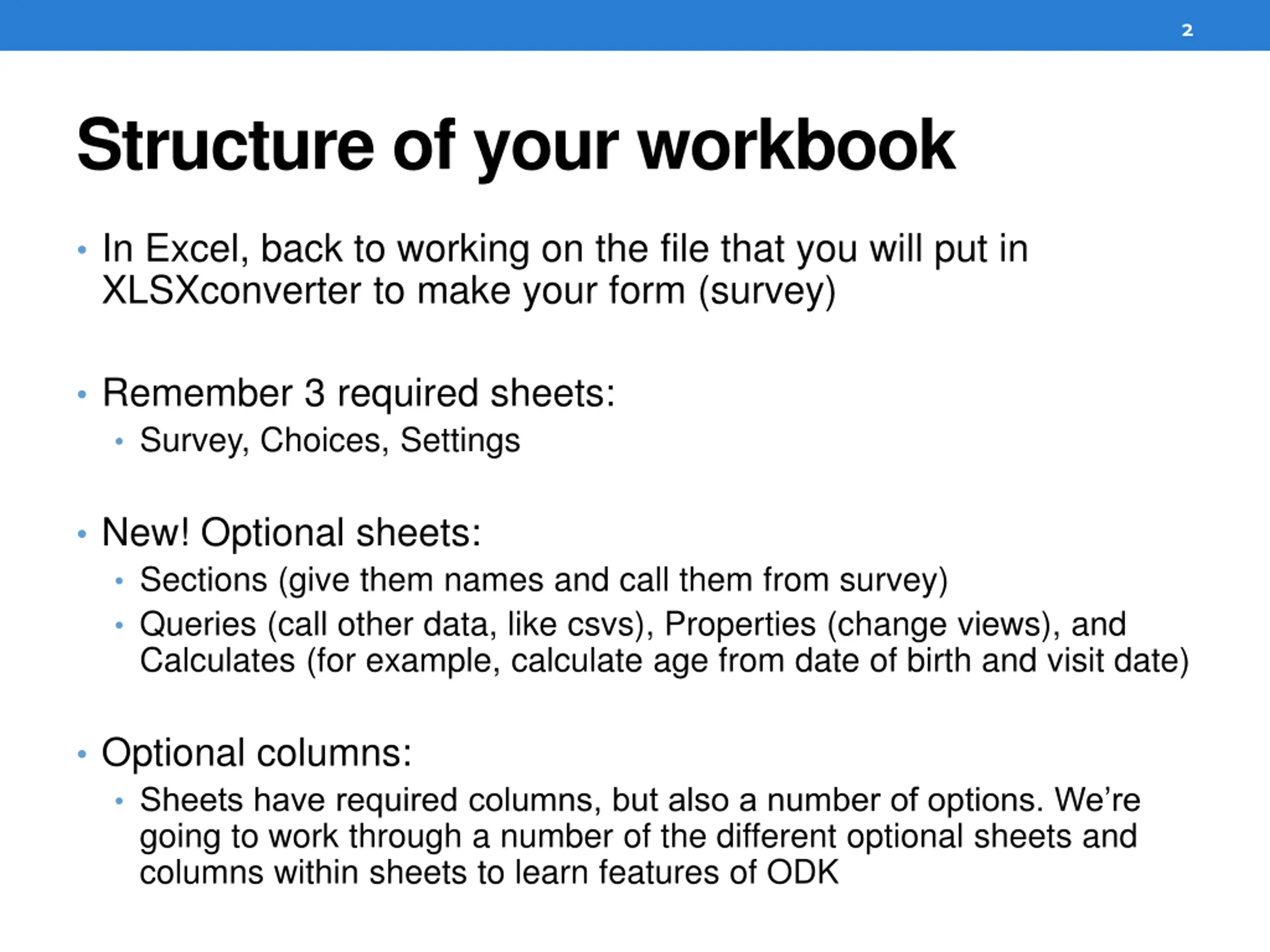 2 Structure of your workbook In Excel, back to working on the file that you will put in XLSXconverter to make your form (survey) Remember 3 required sheets: Survey, Choices, Settings New! Optional sheets: Sections (give them names and call them from survey) Queries (call other data, like csvs), Properties (change views), and Calculates (for example, calculate age from date of birth and visit date) Optional columns: Sheets have required columns, but also a number of options. We re going to work through a number of the different optional sheets and columns within sheets to learn features of ODK