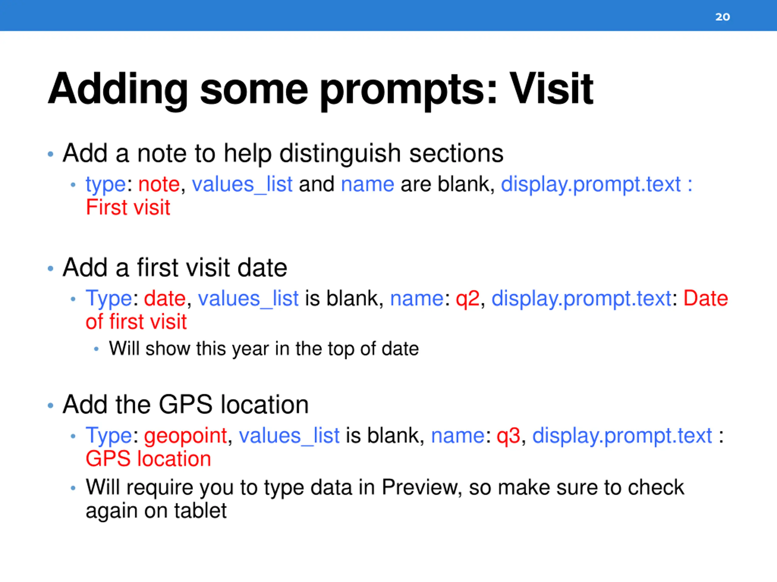 20 Adding some prompts: Visit Add a note to help distinguish sections type: note, values_list and name are blank, display.prompt.text : First visit Add a first visit date Type: date, values_list is blank, name: q2, display.prompt.text: Date of first visit Will show this year in the top of date Add the GPS location Type: geopoint, values_list is blank, name: q3, display.prompt.text : GPS location Will require you to type data in Preview, so make sure to check again on tablet