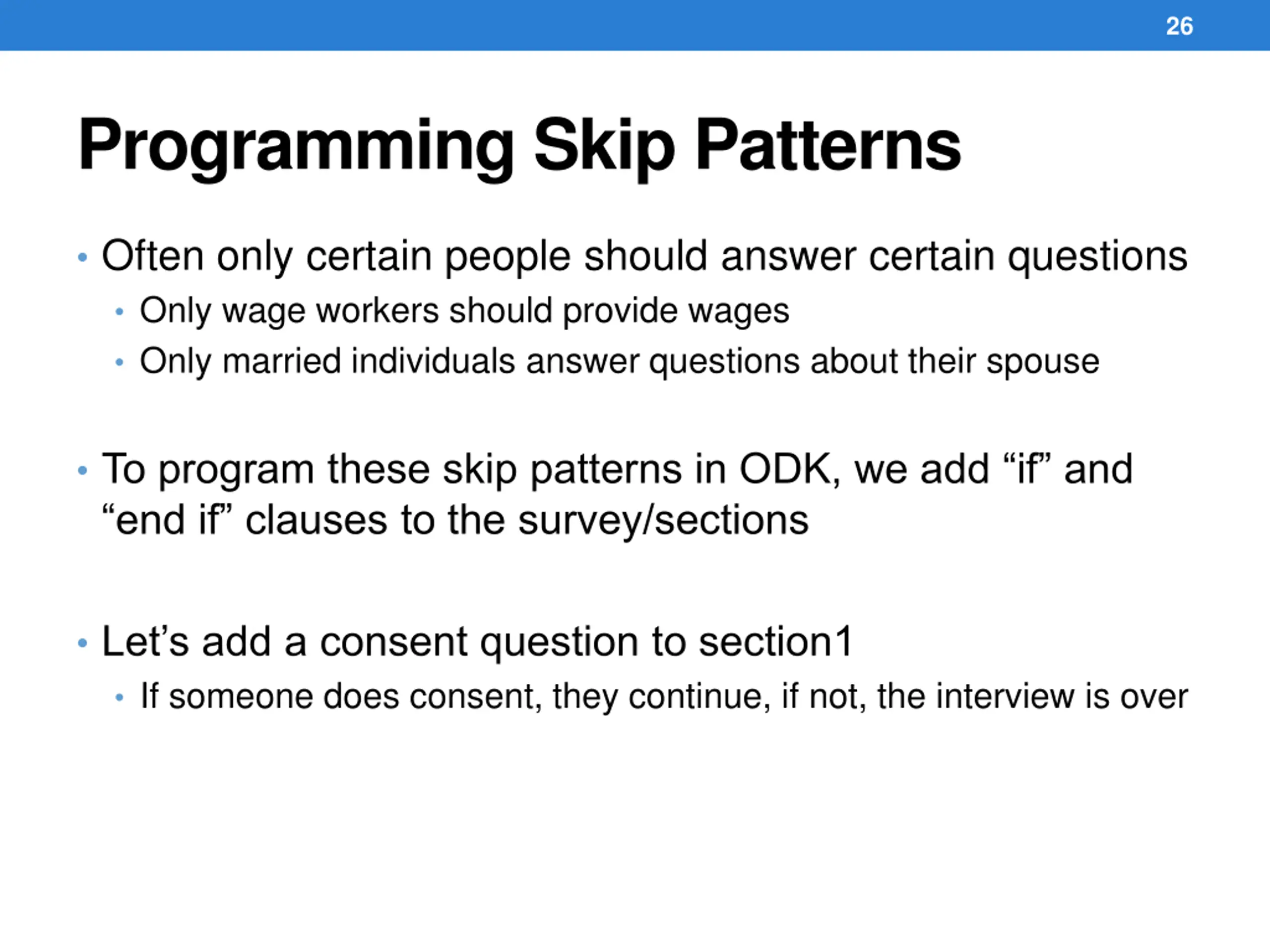 26 Programming Skip Patterns Often only certain people should answer certain questions Only wage workers should provide wages Only married individuals answer questions about their spouse To program these skip patterns in ODK, we add if and end if clauses to the survey/sections Let s add a consent question to section1 If someone does consent, they continue, if not, the interview is over