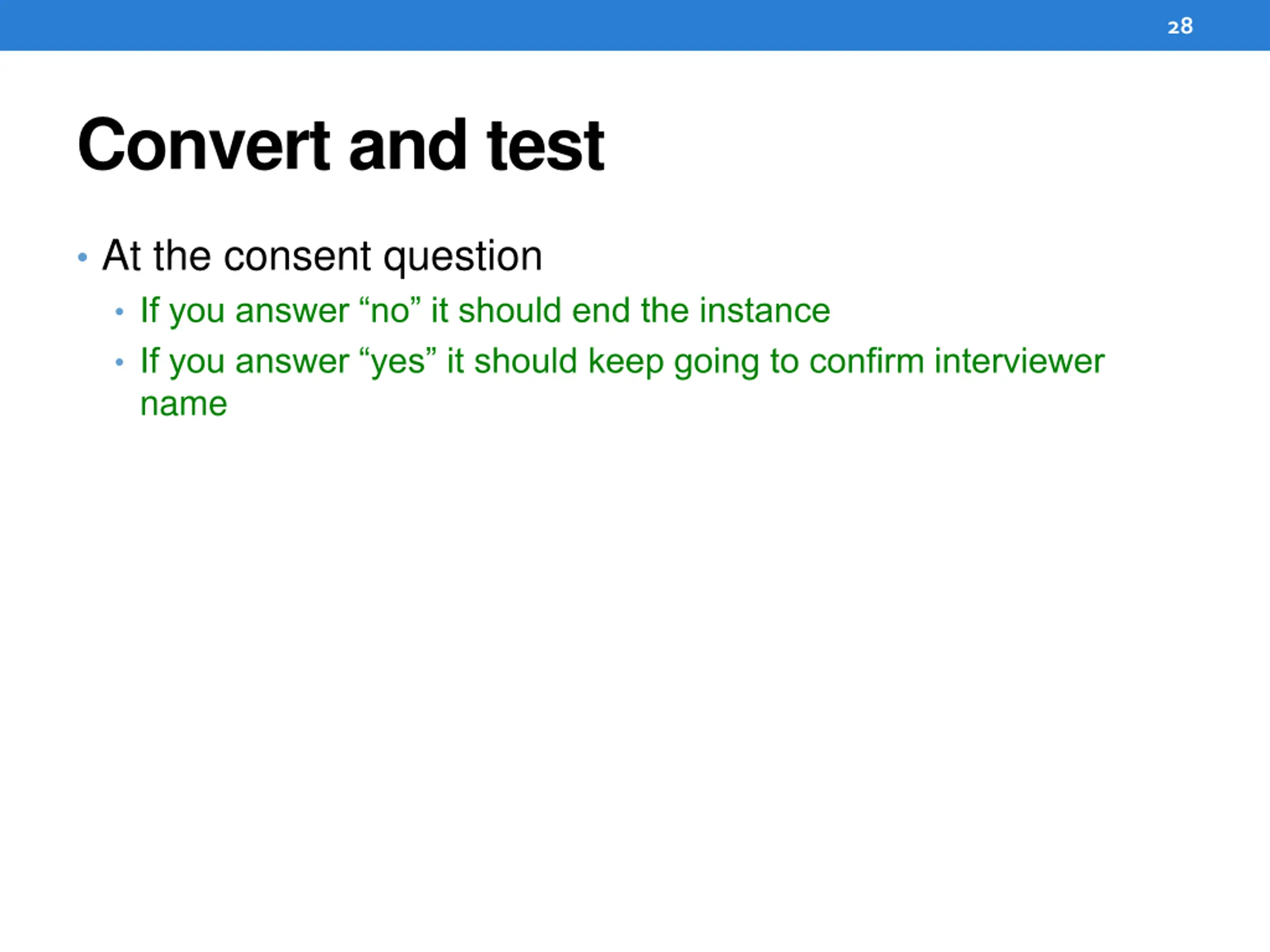 28 Convert and test At the consent question If you answer no it should end the instance If you answer yes it should keep going to confirm interviewer name