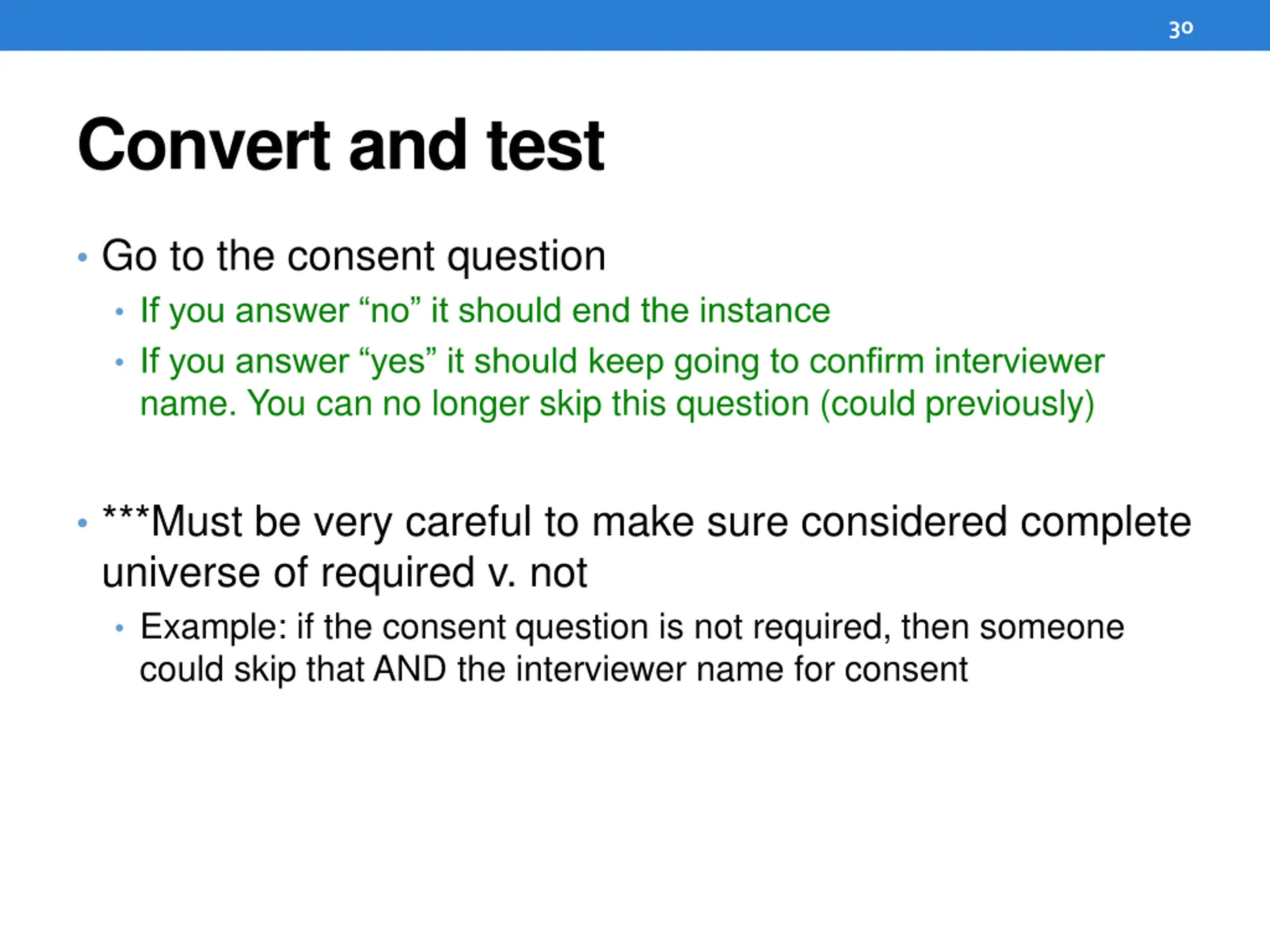 30 Convert and test Go to the consent question If you answer no it should end the instance If you answer yes it should keep going to confirm interviewer name. You can no longer skip this question (could previously) ***Must be very careful to make sure considered complete universe of required v. not Example: if the consent question is not required, then someone could skip that AND the interviewer name for consent
