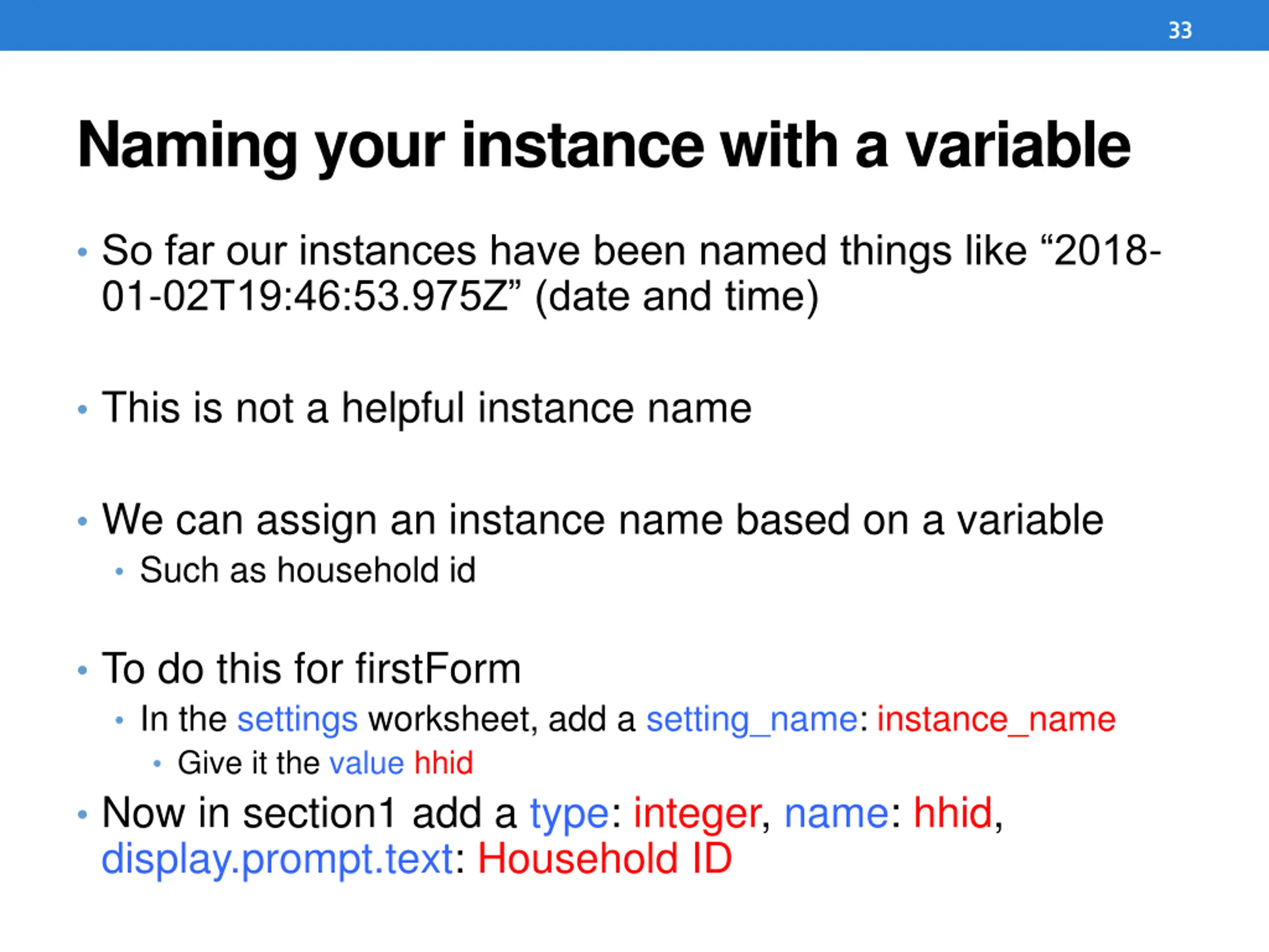 33 Naming your instance with a variable So far our instances have been named things like 2018- 01-02T19:46:53.975Z (date and time) This is not a helpful instance name We can assign an instance name based on a variable Such as household id To do this for firstForm In the settings worksheet, add a setting_name: instance_name Give it the value hhid Now in section1 add a type: integer, name: hhid, display.prompt.text: Household ID