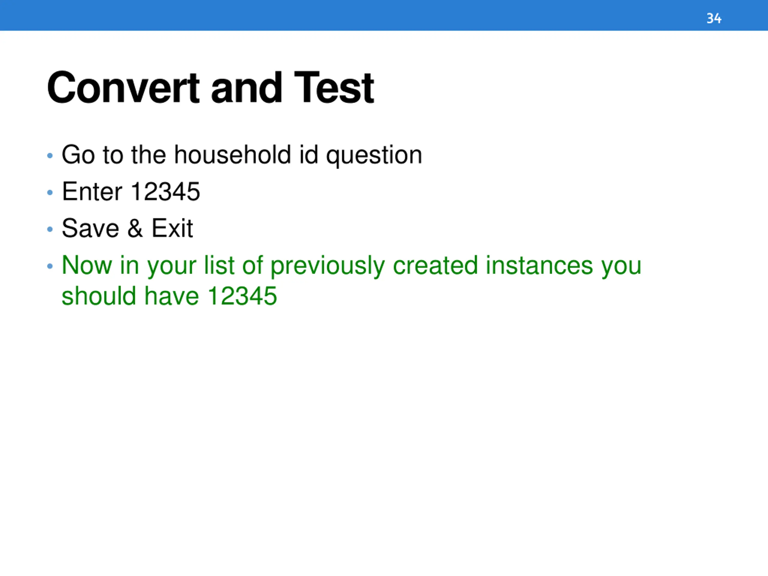34 Convert and Test Go to the household id question Enter 12345 Save & Exit Now in your list of previously created instances you should have 12345