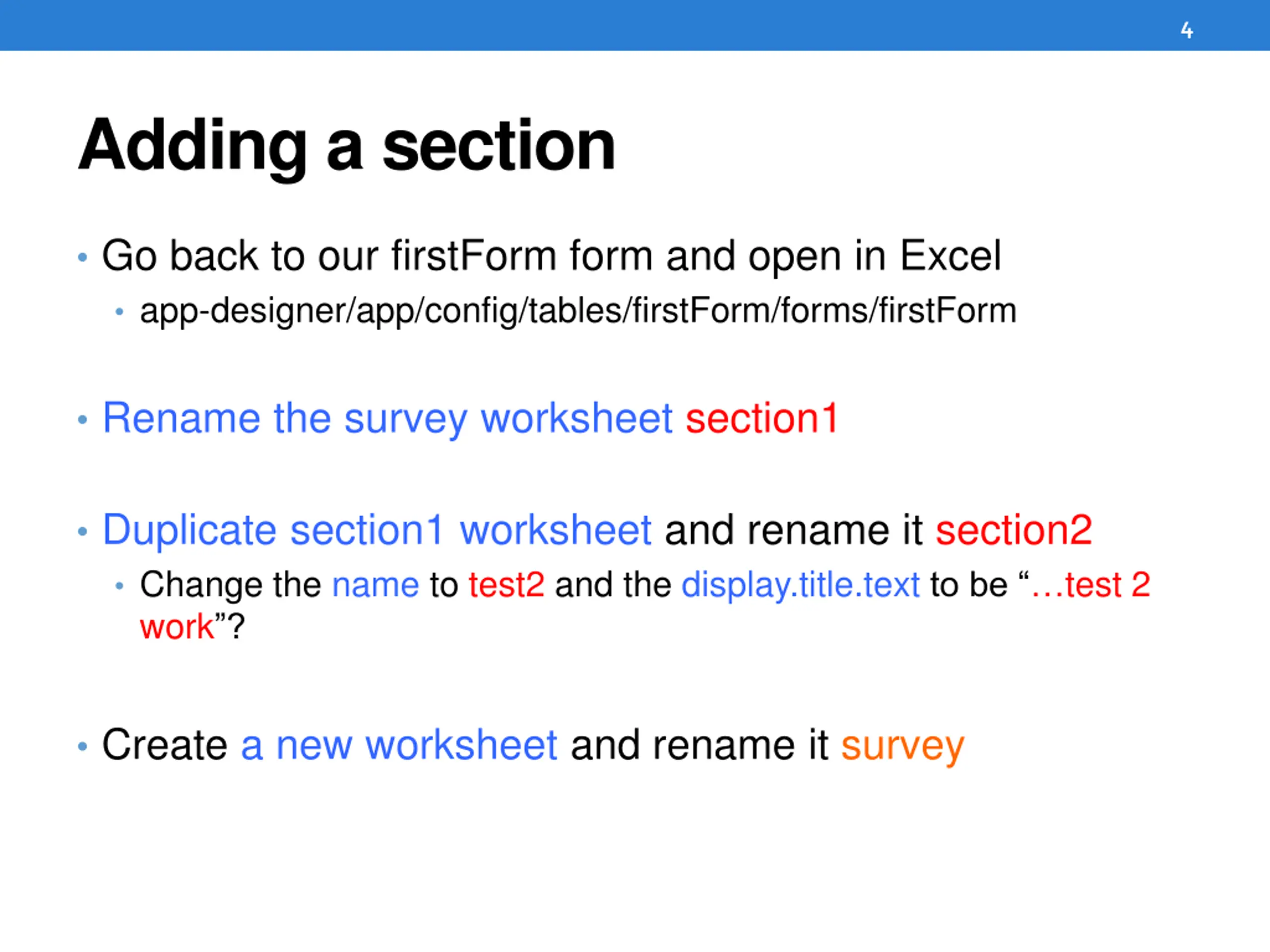 4 Adding a section Go back to our firstForm form and open in Excel app-designer/app/config/tables/firstForm/forms/firstForm Rename the survey worksheet section1 Duplicate section1 worksheet and rename it section2 Change the name to test2 and the display.title.text to be test 2 work ? Create a new worksheet and rename it survey