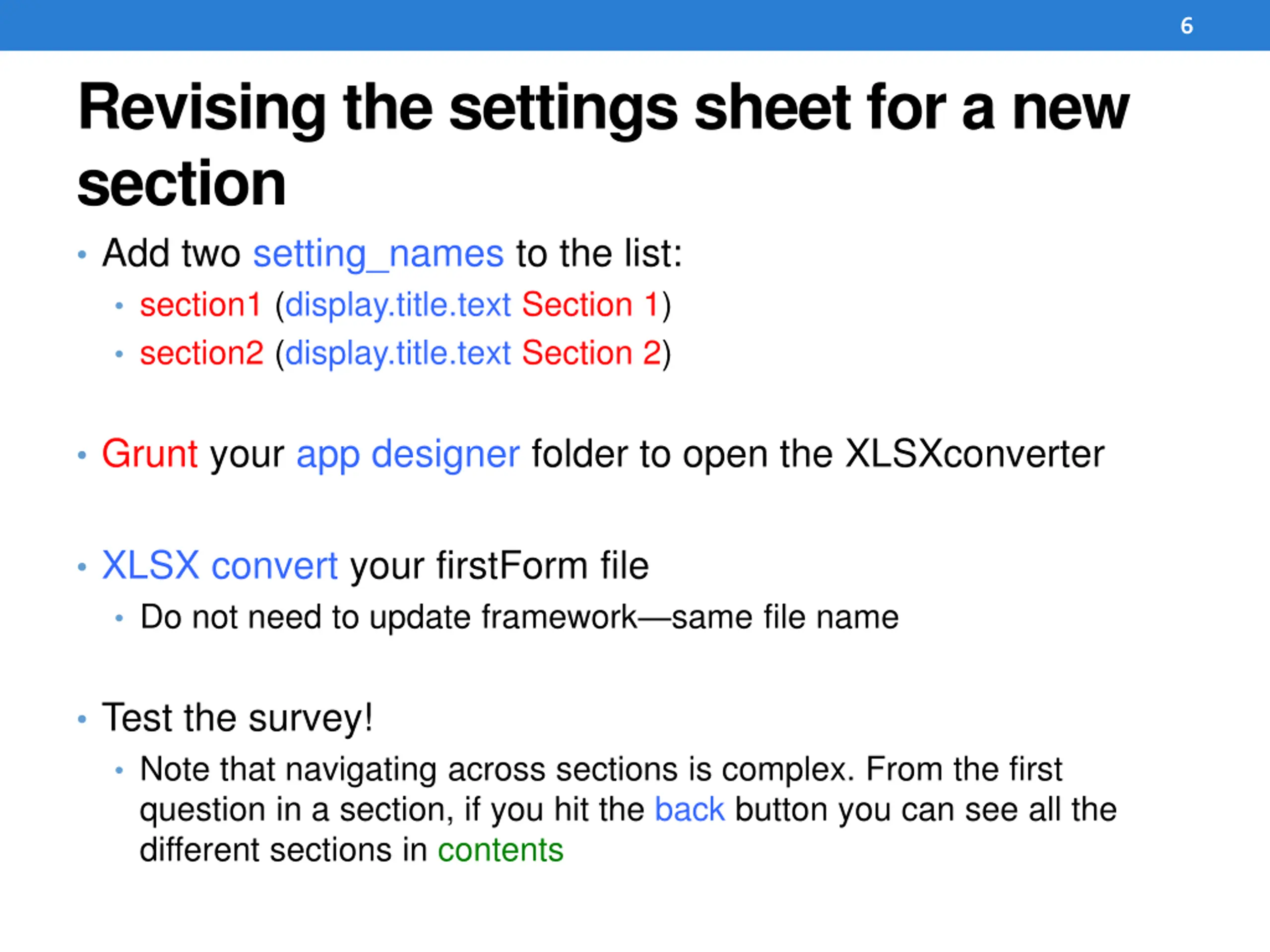 6 Revising the settings sheet for a new section Add two setting_names to the list: section1 (display.title.text Section 1) section2 (display.title.text Section 2) Grunt your app designer folder to open the XLSXconverter XLSX convert your firstForm file Do not need to update framework same file name Test the survey! Note that navigating across sections is complex. From the first question in a section, if you hit the back button you can see all the different sections in contents