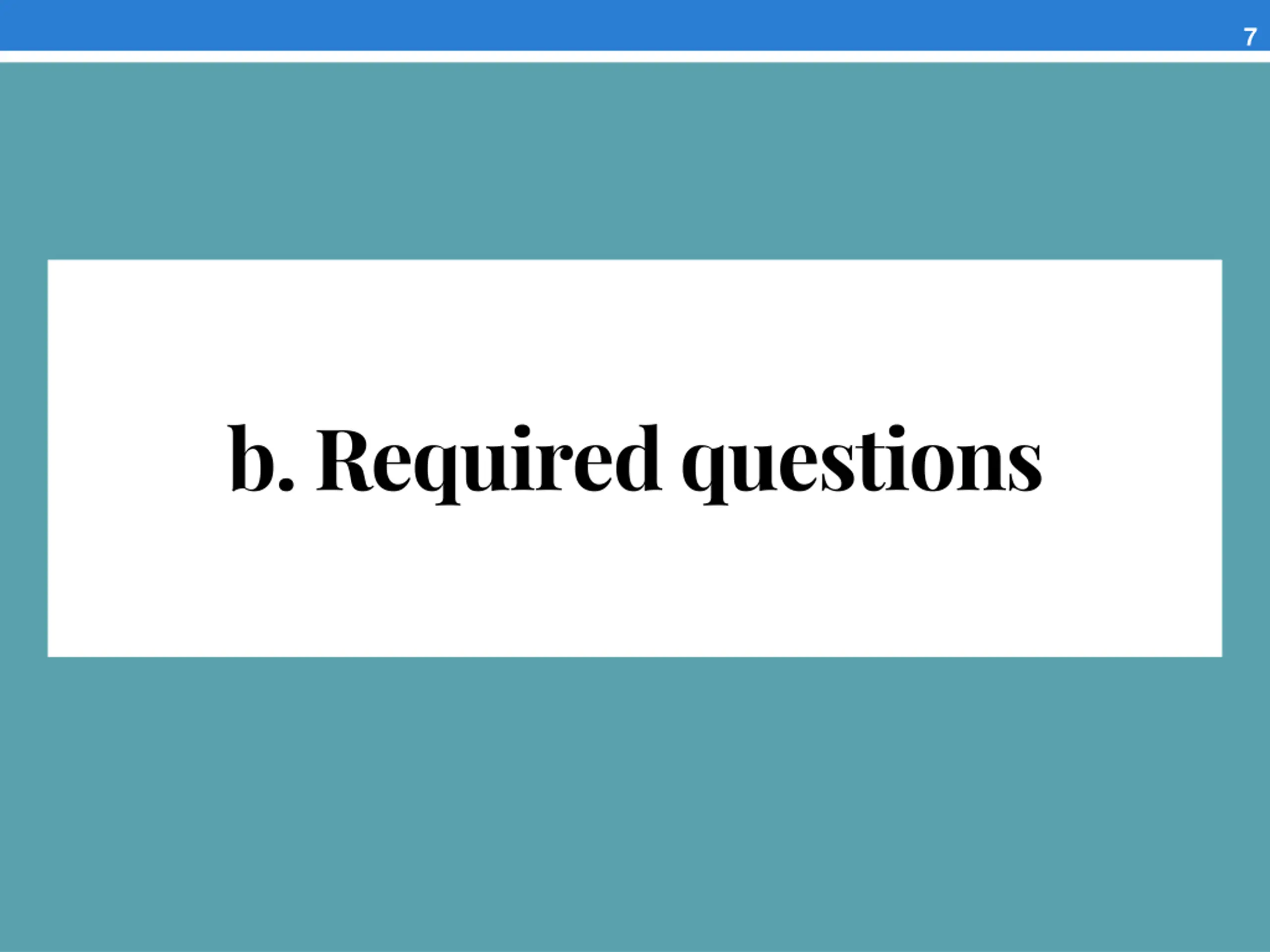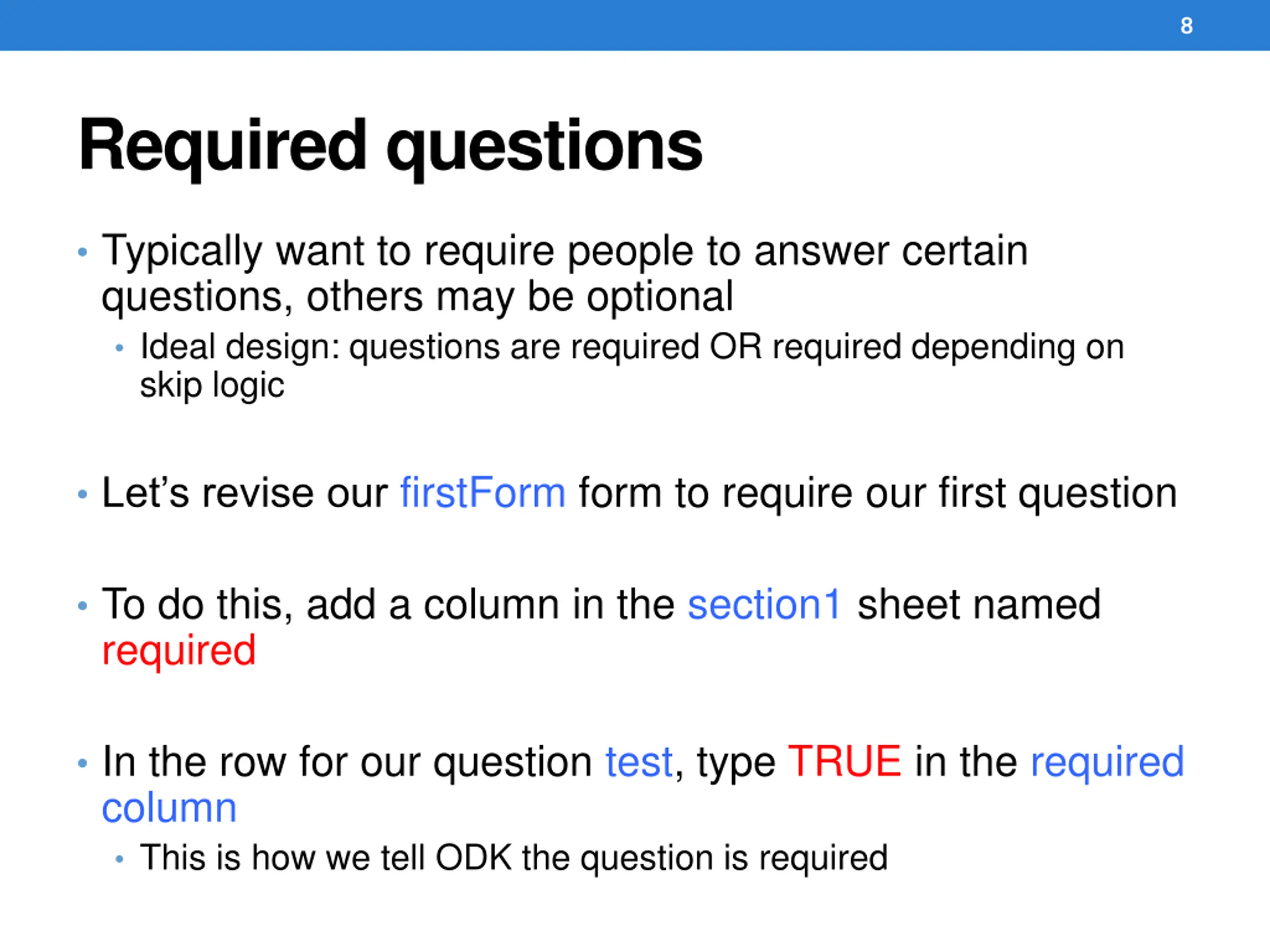 8 Required questions Typically want to require people to answer certain questions, others may be optional Ideal design: questions are required OR required depending on skip logic Let s revise our firstForm form to require our first question To do this, add a column in the section1 sheet named required In the row for our question test, type TRUE in the required column This is how we tell ODK the question is required
