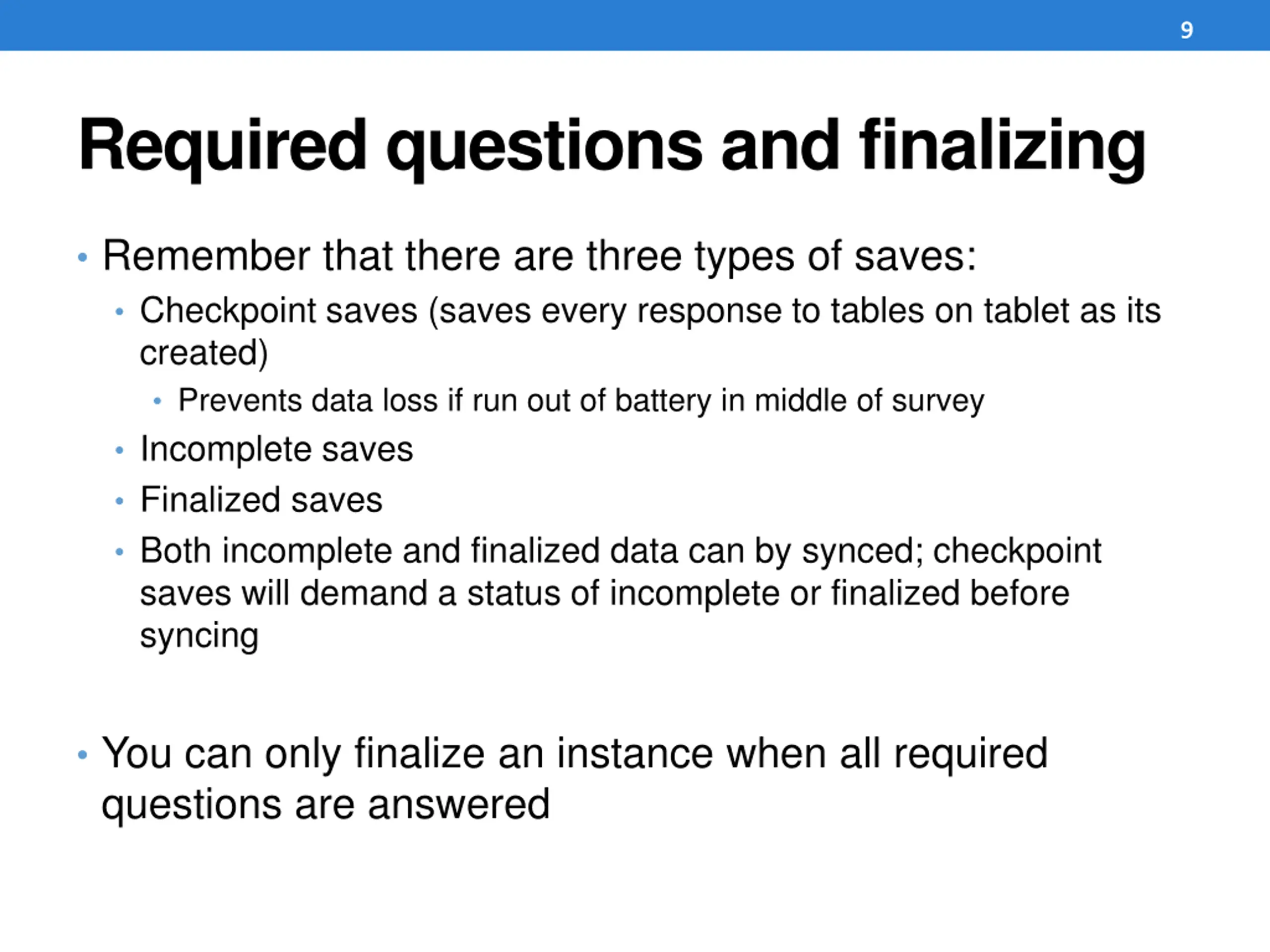 9 Required questions and finalizing Remember that there are three types of saves: Checkpoint saves (saves every response to tables on tablet as its created) Prevents data loss if run out of battery in middle of survey Incomplete saves Finalized saves Both incomplete and finalized data can by synced; checkpoint saves will demand a status of incomplete or finalized before syncing You can only finalize an instance when all required questions are answered