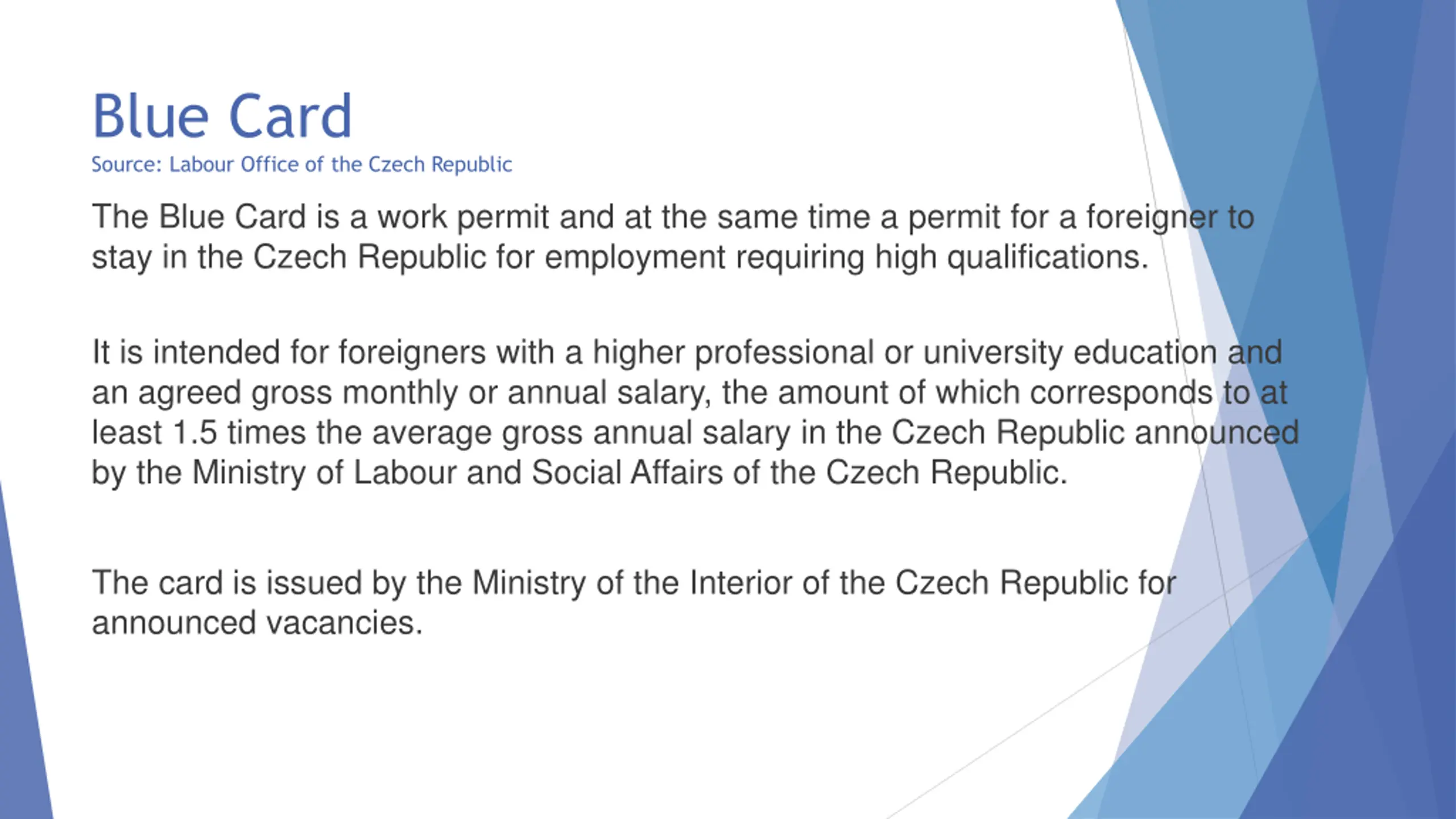 Blue Card Source: Labour Office of the Czech Republic The Blue Card is a work permit and at the same time a permit for a foreigner to stay in the Czech Republic for employment requiring high qualifications. It is intended for foreigners with a higher professional or university education and an agreed gross monthly or annual salary, the amount of which corresponds to at least 1.5 times the average gross annual salary in the Czech Republic announced by the Ministry of Labour and Social Affairs of the Czech Republic. The card is issued by the Ministry of the Interior of the Czech Republic for announced vacancies.