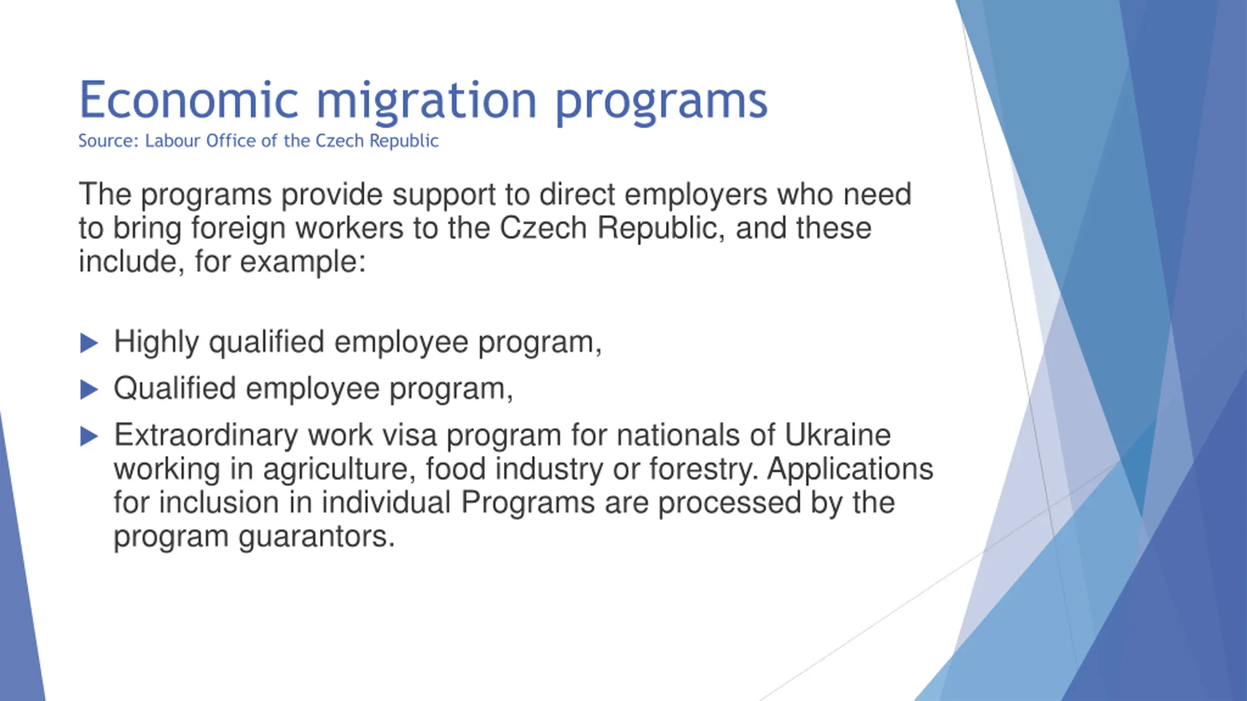 Economic migration programs Source: Labour Office of the Czech Republic The programs provide support to direct employers who need to bring foreign workers to the Czech Republic, and these include, for example: Highly qualified employee program, Qualified employee program, Extraordinary work visa program for nationals of Ukraine working in agriculture, food industry or forestry. Applications for inclusion in individual Programs are processed by the program guarantors.