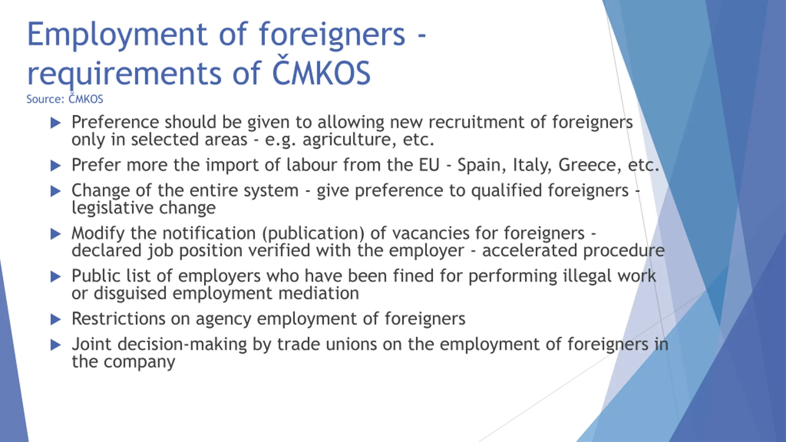 Employment of foreigners - requirements of MKOS Source: MKOS Preference should be given to allowing new recruitment of foreigners only in selected areas - e.g. agriculture, etc. Prefer more the import of labour from the EU - Spain, Italy, Greece, etc. Change of the entire system - give preference to qualified foreigners - legislative change Modify the notification (publication) of vacancies for foreigners - declared job position verified with the employer - accelerated procedure Public list of employers who have been fined for performing illegal work or disguised employment mediation Restrictions on agency employment of foreigners Joint decision-making by trade unions on the employment of foreigners in the company