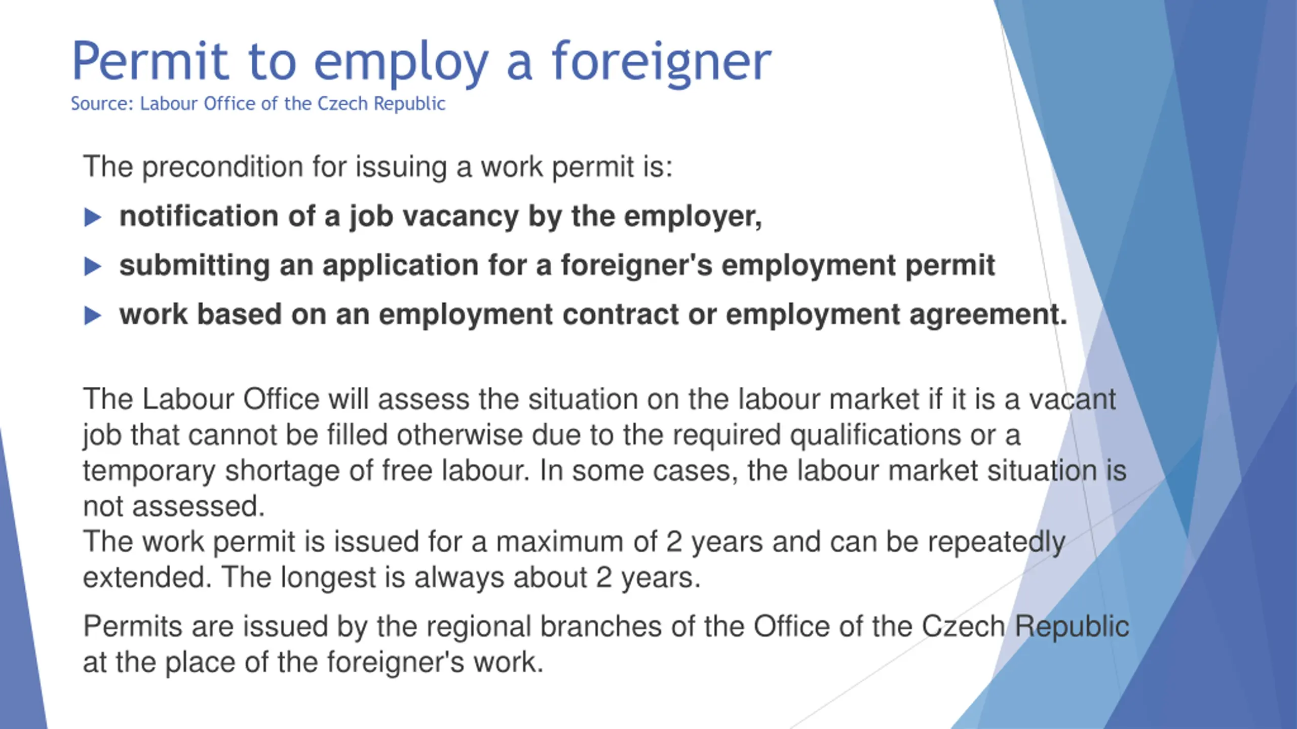 Permit to employ a foreigner Source: Labour Office of the Czech Republic The precondition for issuing a work permit is: notification of a job vacancy by the employer, submitting an application for a foreigner's employment permit work based on an employment contract or employment agreement. The Labour Office will assess the situation on the labour market if it is a vacant job that cannot be filled otherwise due to the required qualifications or a temporary shortage of free labour. In some cases, the labour market situation is not assessed. The work permit is issued for a maximum of 2 years and can be repeatedly extended. The longest is always about 2 years. Permits are issued by the regional branches of the Office of the Czech Republic at the place of the foreigner's work.