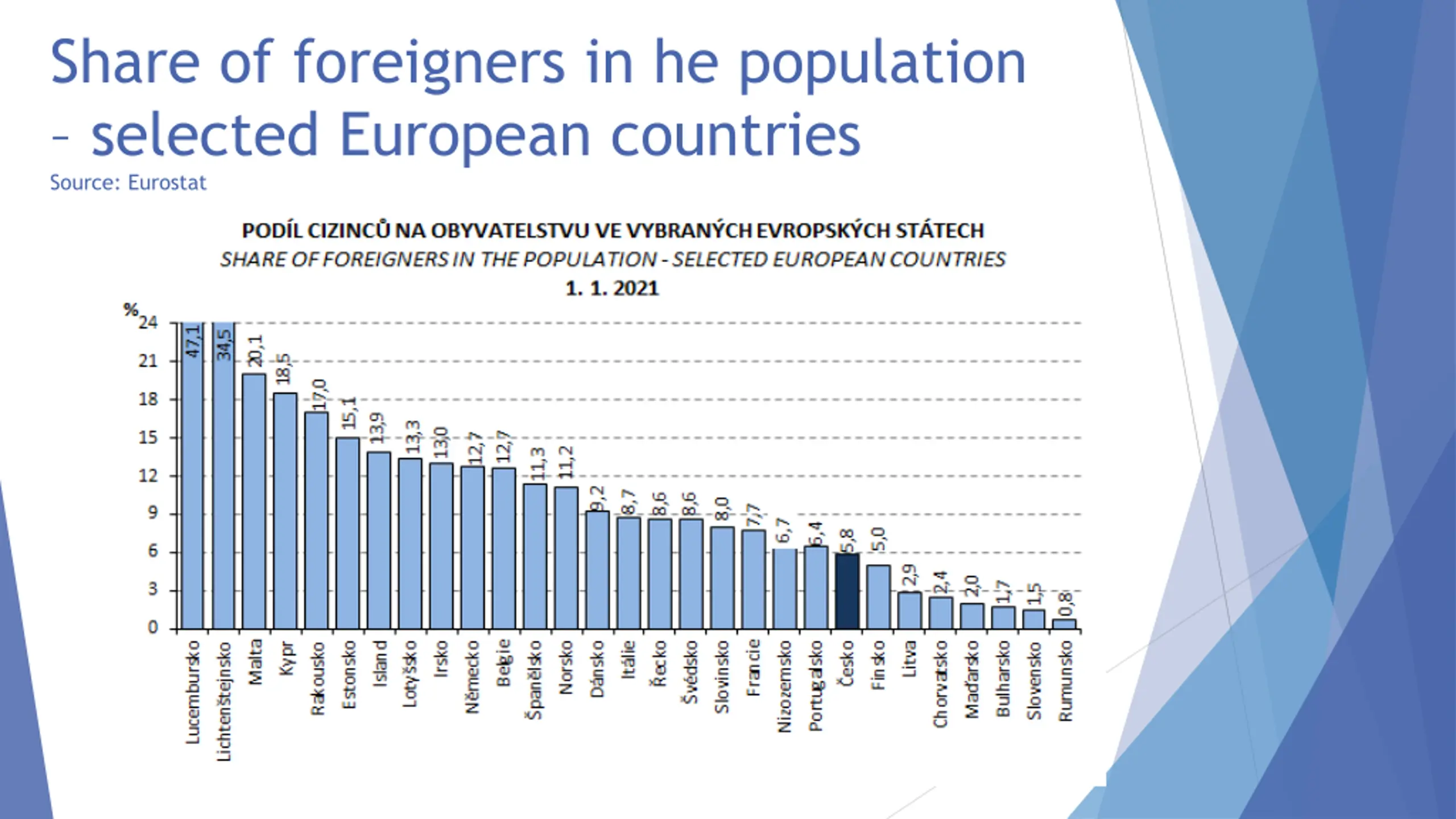 Numbers of foreigners Source: Directorate of Foreign Police Service The number of foreigners in the Czech Republic is gradually increasing, in total there were 1,113,698 in the Czech Republic as of 31.12.2022, of which: EU 27: 226 426 Other countries: 887 272