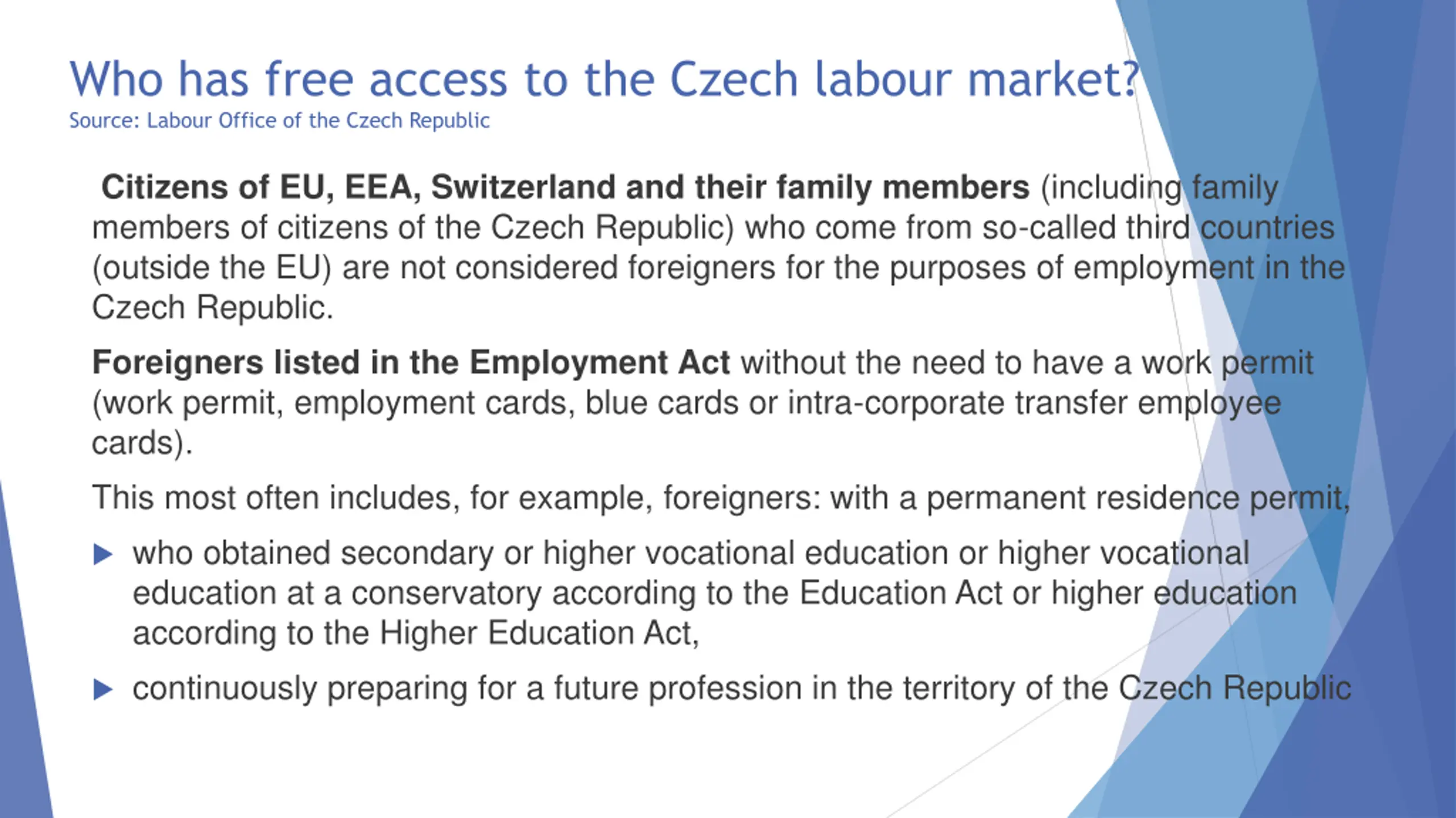 Who has free access to the Czech labour market? Source: Labour Office of the Czech Republic Citizens of EU, EEA, Switzerland and their family members (including family members of citizens of the Czech Republic) who come from so-called third countries (outside the EU) are not considered foreigners for the purposes of employment in the Czech Republic. Foreigners listed in the Employment Act without the need to have a work permit (work permit, employment cards, blue cards or intra-corporate transfer employee cards). This most often includes, for example, foreigners: with a permanent residence permit, who obtained secondary or higher vocational education or higher vocational education at a conservatory according to the Education Act or higher education according to the Higher Education Act, continuously preparing for a future profession in the territory of the Czech Republic