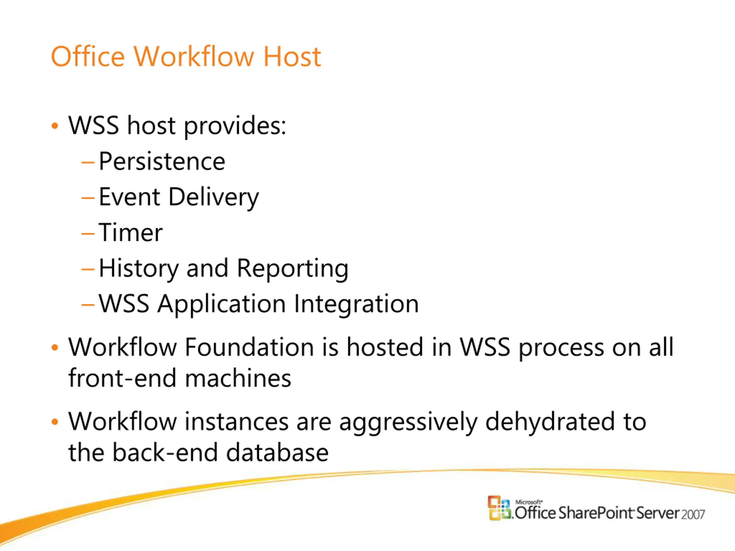 Office Workflow Host WSS host provides: Persistence Event Delivery Timer History and Reporting WSS Application Integration Workflow Foundation is hosted in WSS process on all front-end machines Workflow instances are aggressively dehydrated to the back-end database