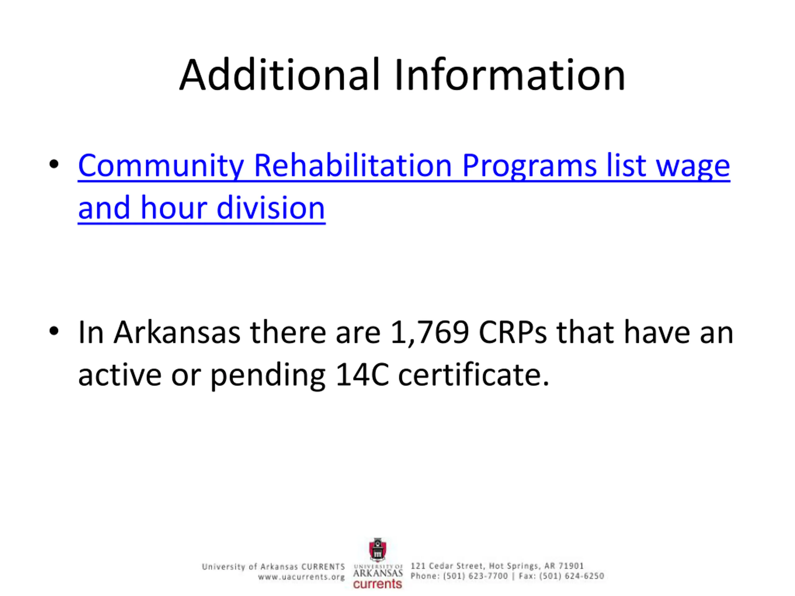 Additional Information Community Rehabilitation Programs list wage and hour division In Arkansas there are 1,769 CRPs that have an active or pending 14C certificate.
