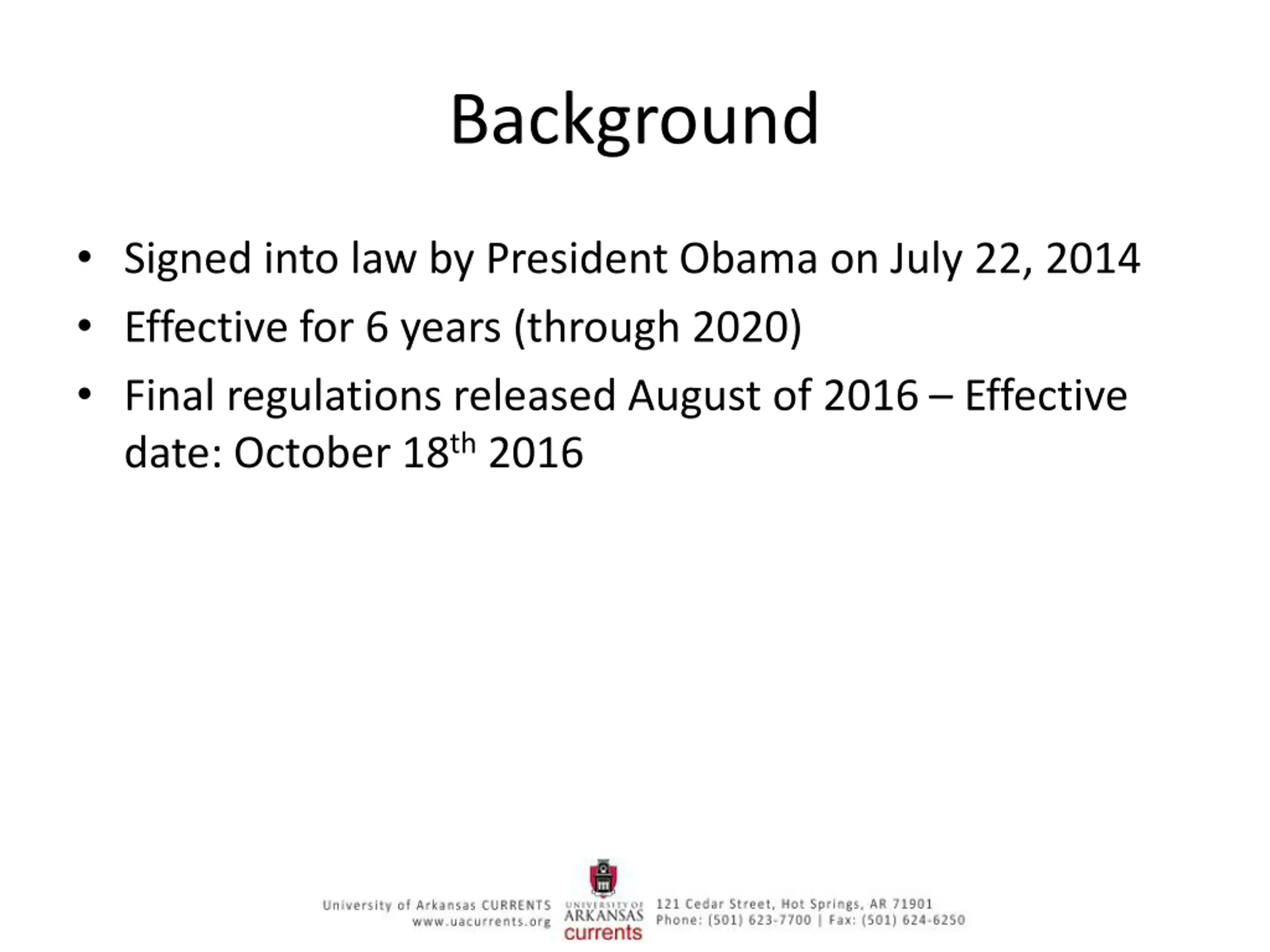 Background Signed into law by President Obama on July 22, 2014 Effective for 6 years (through 2020) Final regulations released August of 2016 Effective date: October 18th 2016