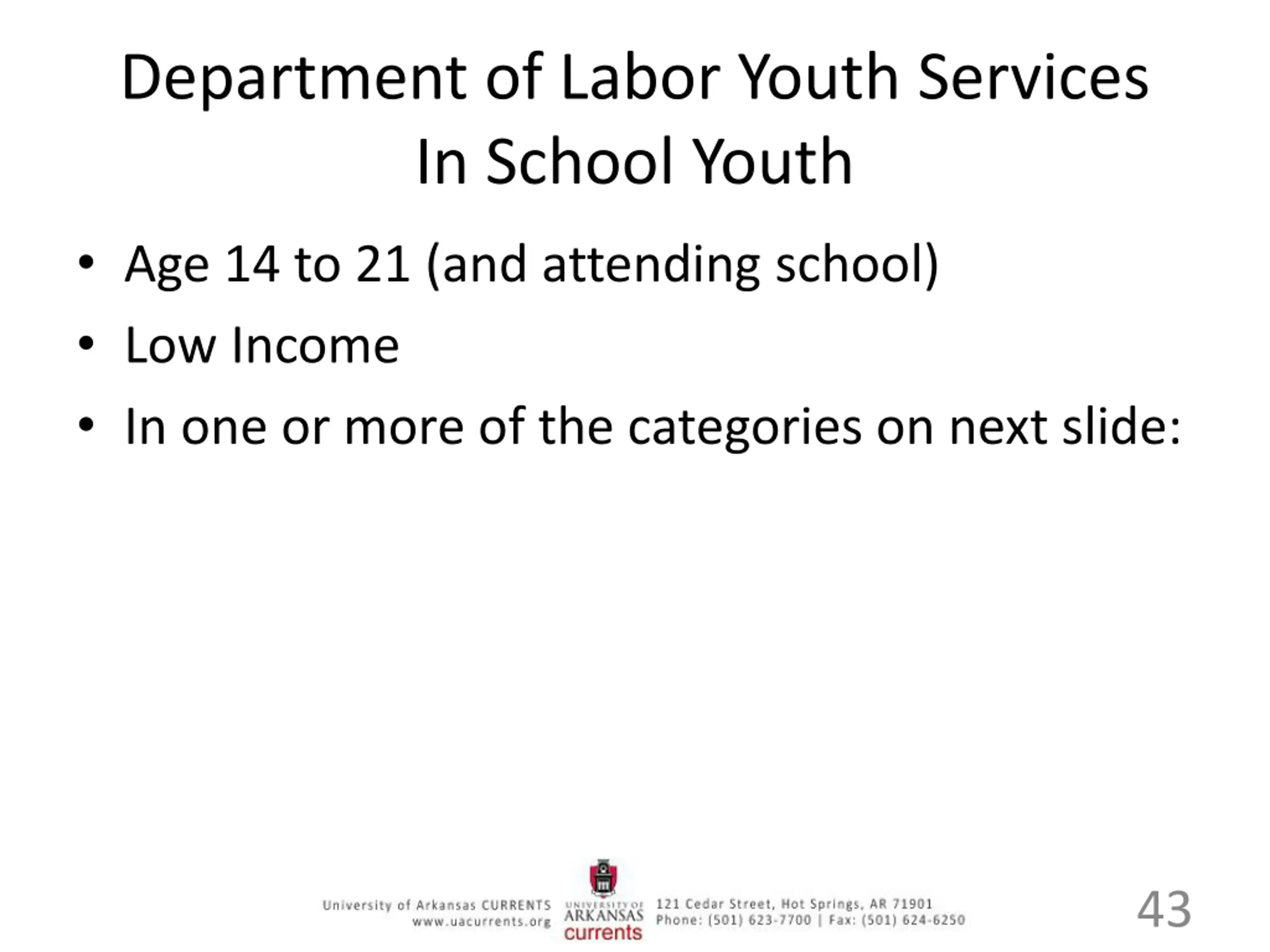 Department of Labor Youth Services In School Youth Age 14 to 21 (and attending school) Low Income In one or more of the categories on next slide: 43
