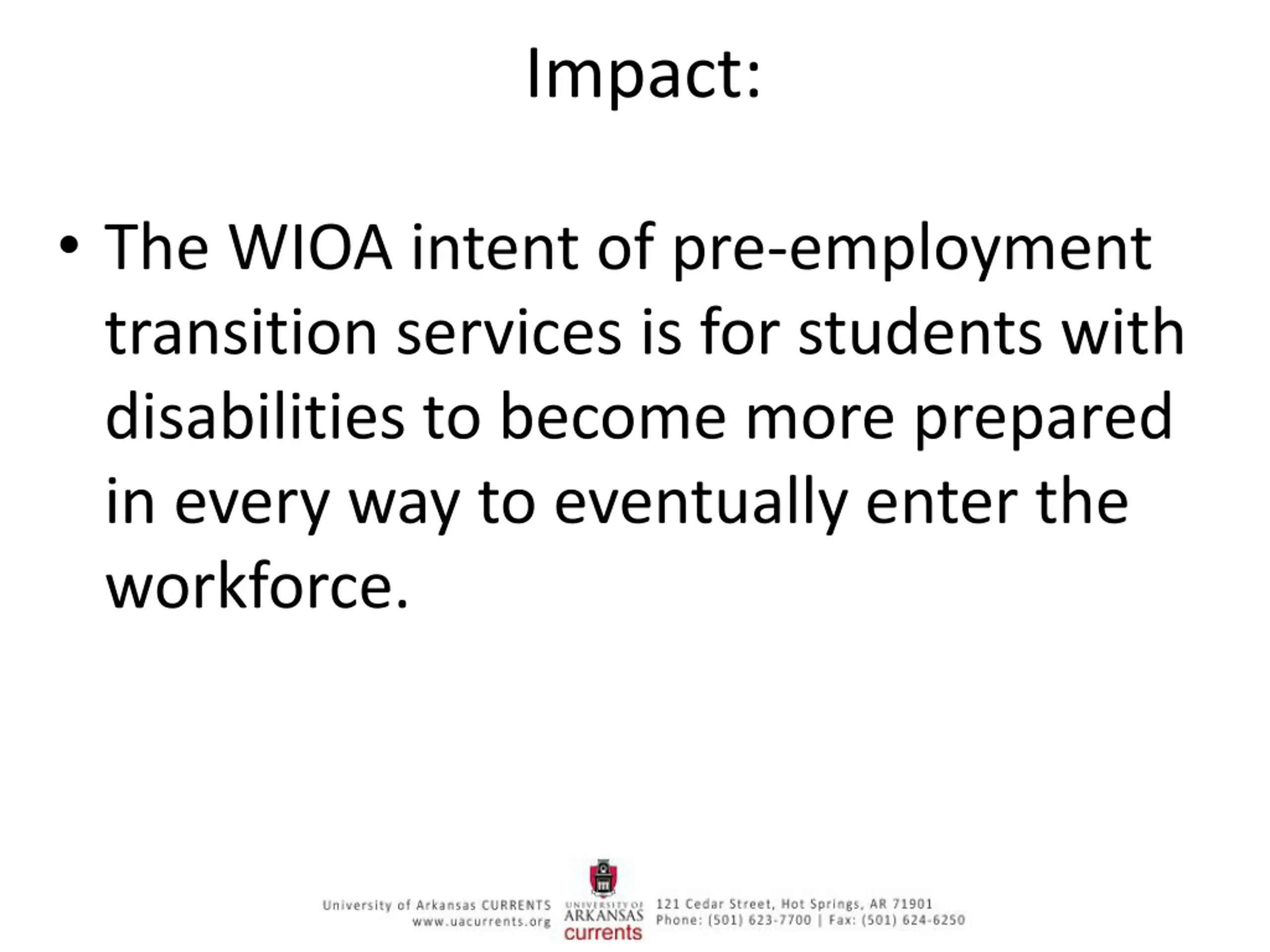 Impact: The WIOA intent of pre-employment transition services is for students with disabilities to become more prepared in every way to eventually enter the workforce.