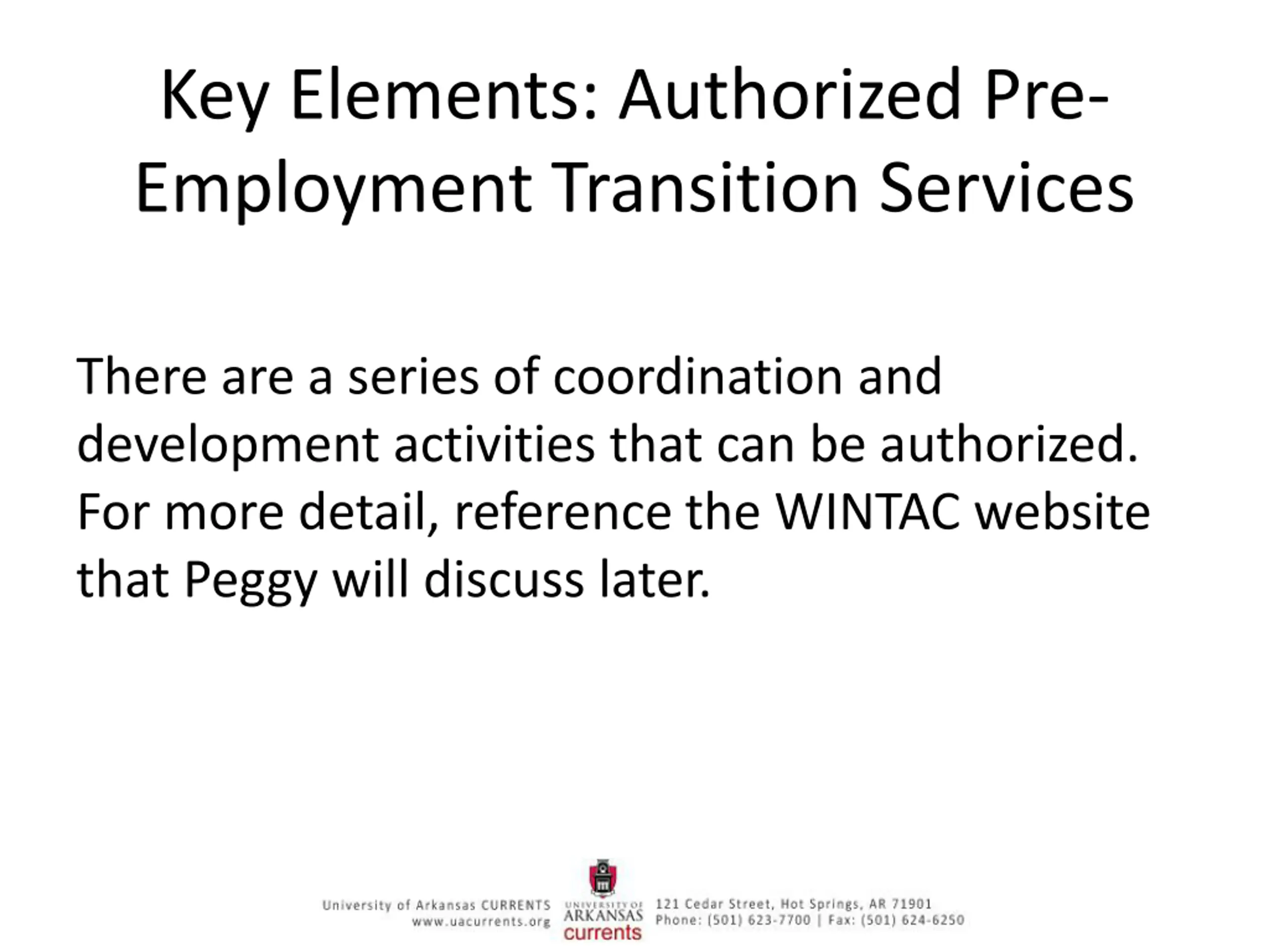 Key Elements: Authorized Pre- Employment Transition Services There are a series of coordination and development activities that can be authorized. For more detail, reference the WINTAC website that Peggy will discuss later.