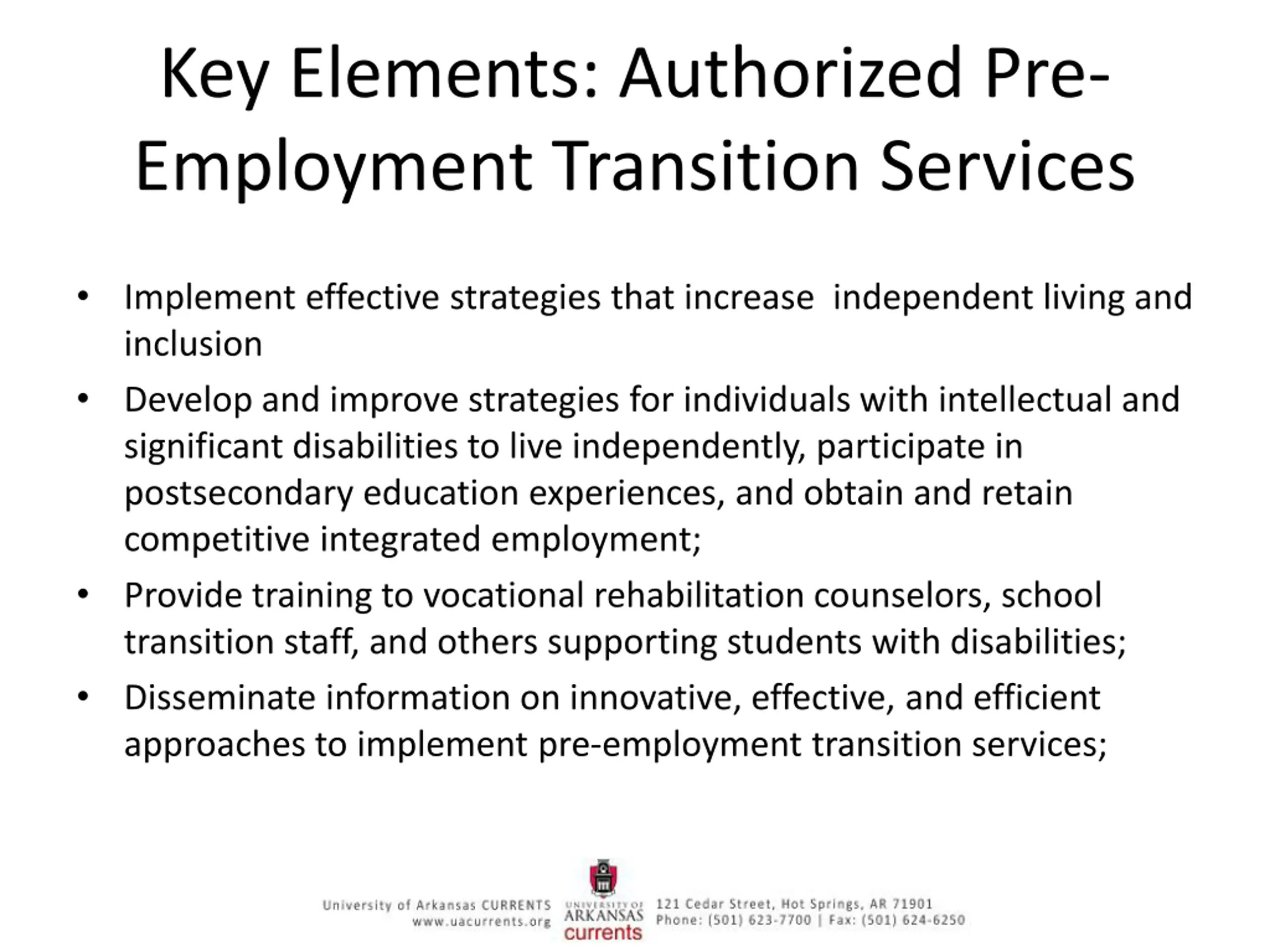 Key Elements: Authorized Pre- Employment Transition Services Implement effective strategies that increase independent living and inclusion Develop and improve strategies for individuals with intellectual and significant disabilities to live independently, participate in postsecondary education experiences, and obtain and retain competitive integrated employment; Provide training to vocational rehabilitation counselors, school transition staff, and others supporting students with disabilities; Disseminate information on innovative, effective, and efficient approaches to implement pre-employment transition services;