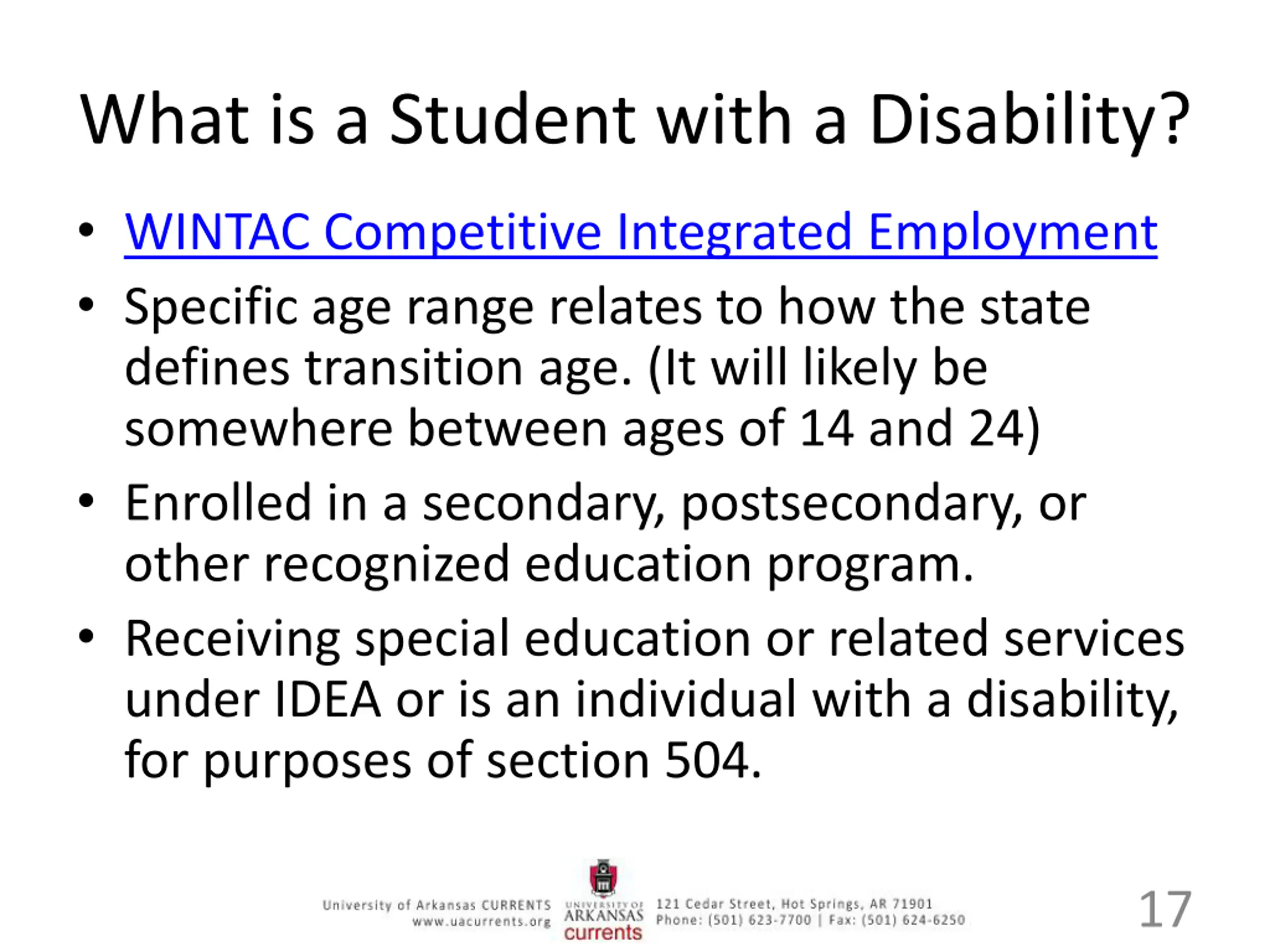 What is a Student with a Disability? WINTAC Competitive Integrated Employment Specific age range relates to how the state defines transition age. (It will likely be somewhere between ages of 14 and 24) Enrolled in a secondary, postsecondary, or other recognized education program. Receiving special education or related services under IDEA or is an individual with a disability, for purposes of section 504. 17
