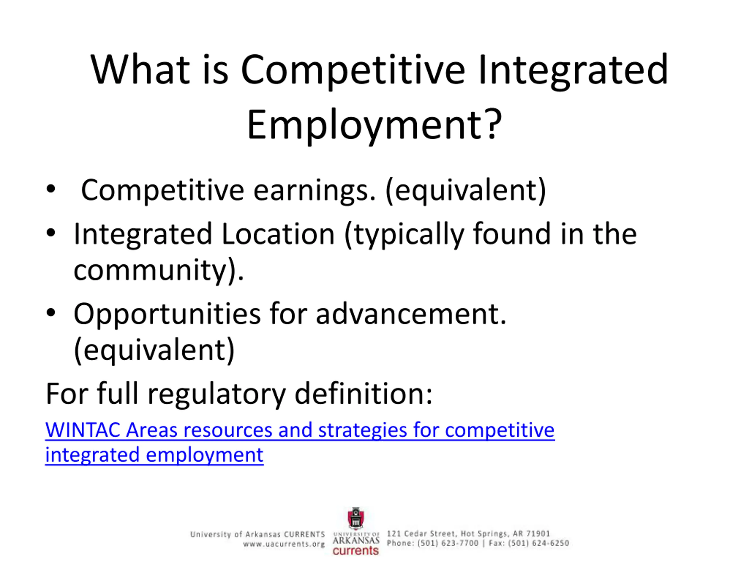 What is Competitive Integrated Employment? Competitive earnings. (equivalent) Integrated Location (typically found in the community). Opportunities for advancement. (equivalent) For full regulatory definition: WINTAC Areas resources and strategies for competitive integrated employment