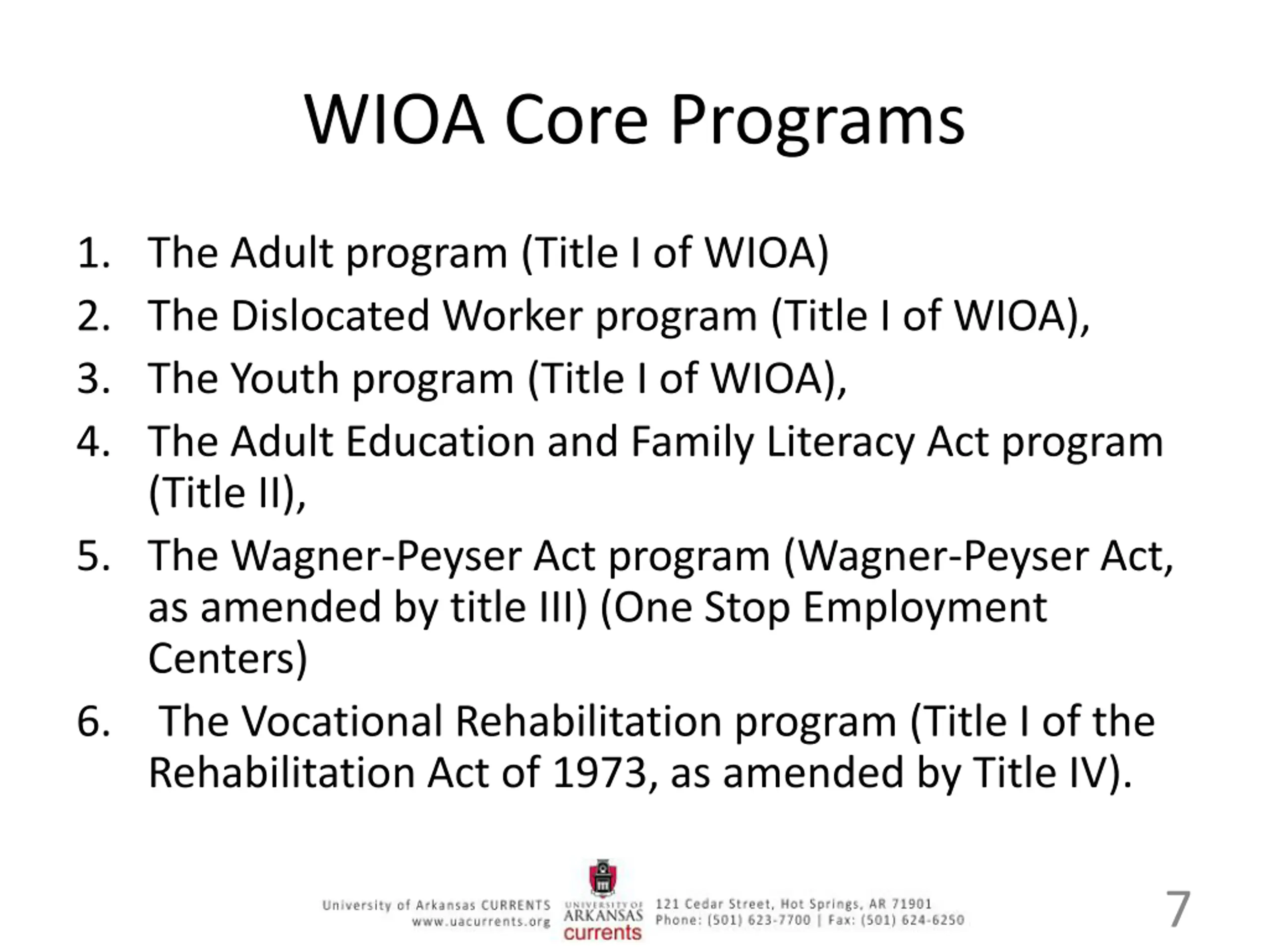 WIOA Core Programs 1. The Adult program (Title I of WIOA) 2. The Dislocated Worker program (Title I of WIOA), 3. The Youth program (Title I of WIOA), 4. The Adult Education and Family Literacy Act program (Title II), 5. The Wagner-Peyser Act program (Wagner-Peyser Act, as amended by title III) (One Stop Employment Centers) 6. The Vocational Rehabilitation program (Title I of the Rehabilitation Act of 1973, as amended by Title IV). 7
