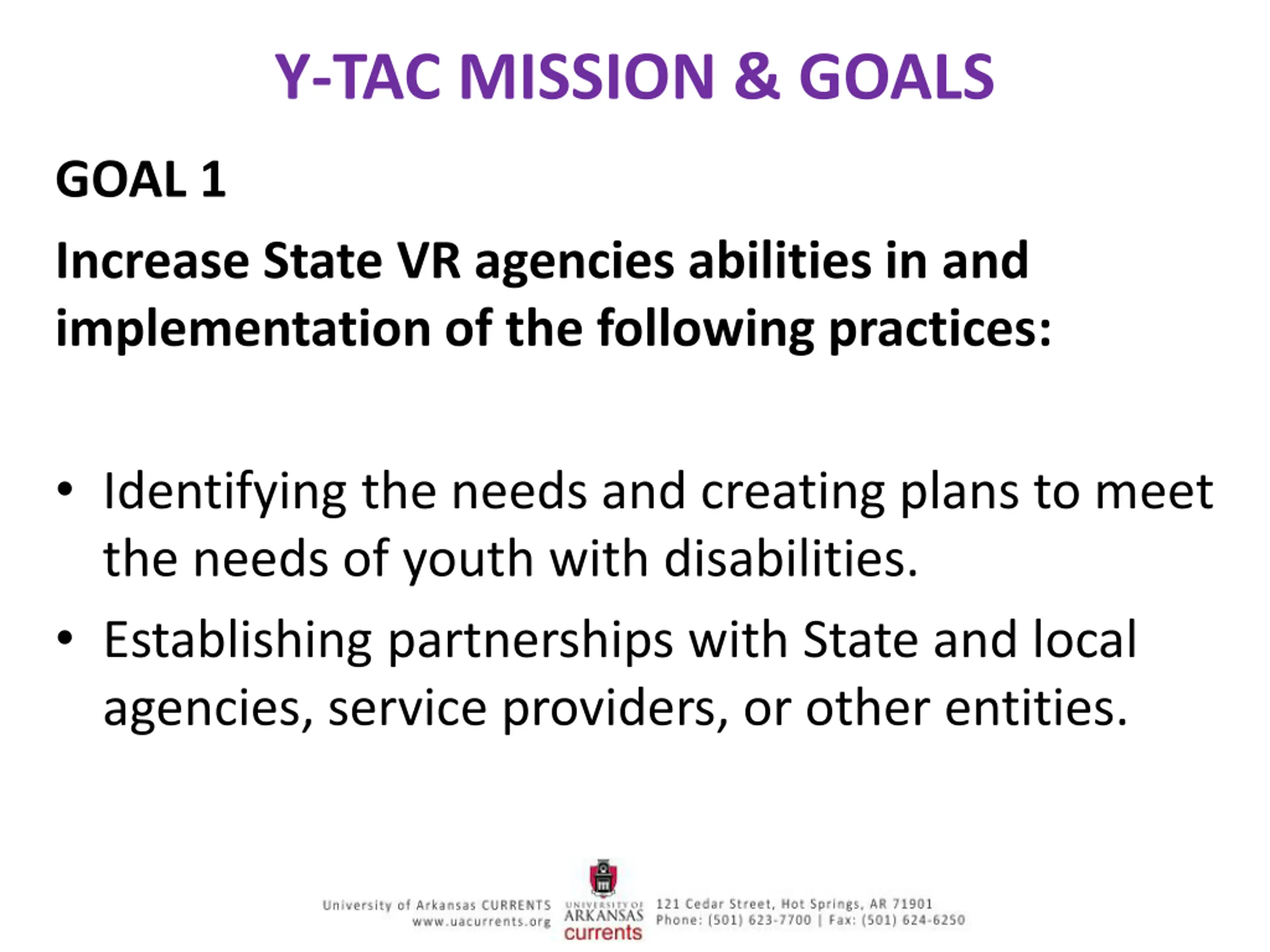 Y-TAC MISSION & GOALS GOAL 1 Increase State VR agencies abilities in and implementation of the following practices: Identifying the needs and creating plans to meet the needs of youth with disabilities. Establishing partnerships with State and local agencies, service providers, or other entities.
