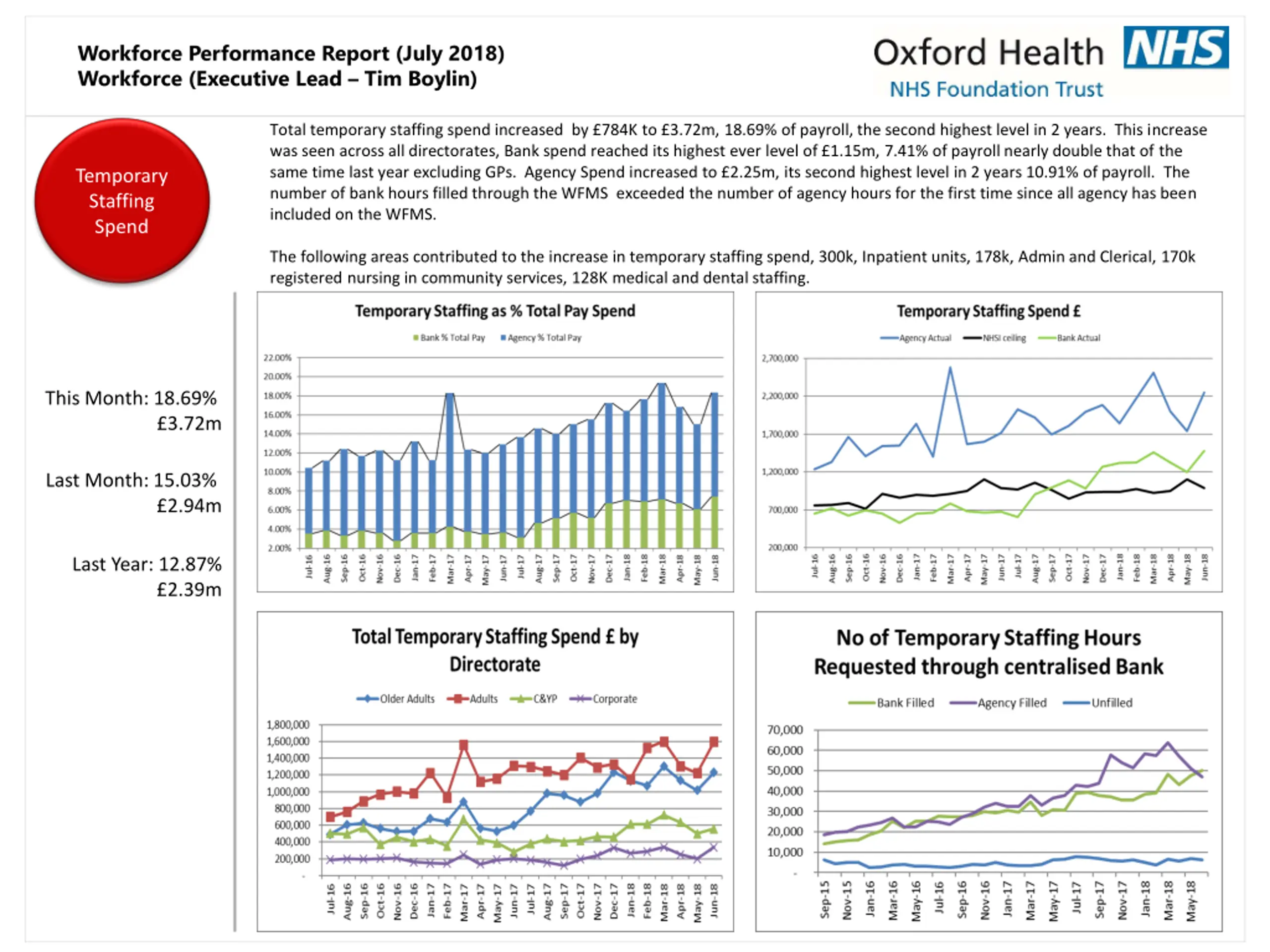 Workforce Performance Report (July 2018) Workforce (Executive Lead Tim Boylin) Total temporary staffing spend increased by 784K to 3.72m, 18.69% of payroll, the second highest level in 2 years. This increase was seen across all directorates, Bank spend reached its highest ever level of 1.15m, 7.41% of payroll nearly double that of the same time last year excluding GPs. Agency Spend increased to 2.25m, its second highest level in 2 years 10.91% of payroll. The number of bank hours filled through the WFMS exceeded the number of agency hours for the first time since all agency has been included on the WFMS. Temporary Staffing Spend The following areas contributed to the increase in temporary staffing spend, 300k, Inpatient units, 178k, Admin and Clerical, 170k registered nursing in community services, 128K medical and dental staffing. This Month: 18.69% 3.72m Last Month: 15.03% 2.94m Last Year: 12.87% 2.39m