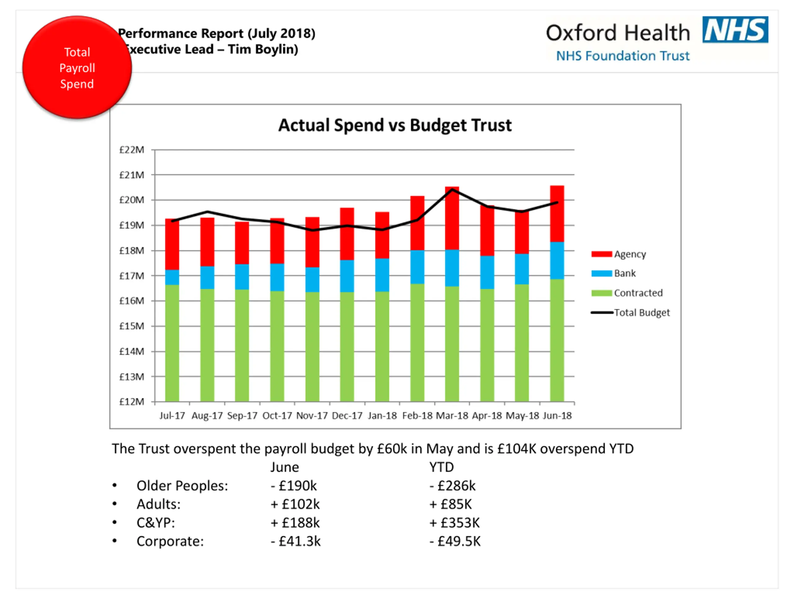 Workforce Performance Report (July 2018) Workforce (Executive Lead Tim Boylin) Total Payroll Spend The Trust overspent the payroll budget by 60k in May and is 104K overspend YTD June Older Peoples: - 190k Adults: + 102k C&YP: + 188k Corporate: - 41.3k YTD - 286k + 85K + 353K - 49.5K