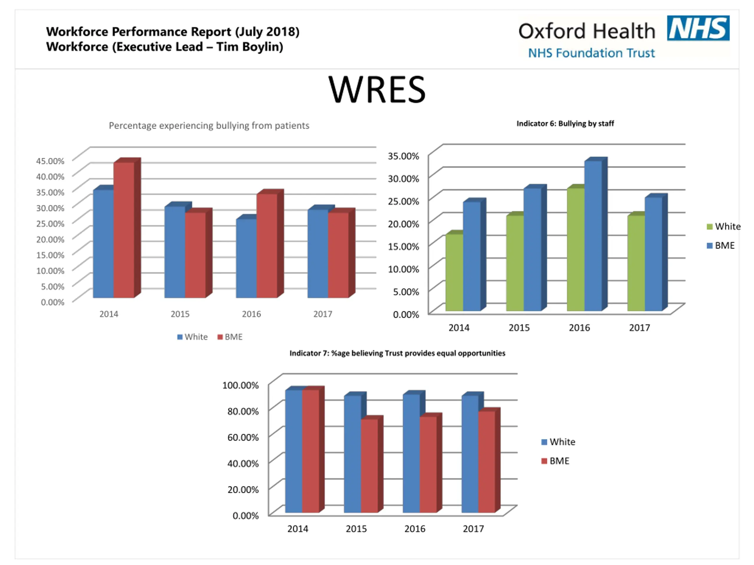 Workforce Performance Report (July 2018) Workforce (Executive Lead Tim Boylin) WRES Indicator 6: Bullying by staff Percentage experiencing bullying from patients 35.00% 45.00% 40.00% 30.00% 35.00% 25.00% 30.00% 20.00% 25.00% White 20.00% BME 15.00% 15.00% 10.00% 10.00% 5.00% 5.00% 0.00% 2014 2015 2016 2017 0.00% 2014 2015 2016 2017 White BME Indicator 7: %age believing Trust provides equal opportunities 100.00% 80.00% 60.00% White BME 40.00% 20.00% 0.00% 2014 2015 2016 2017