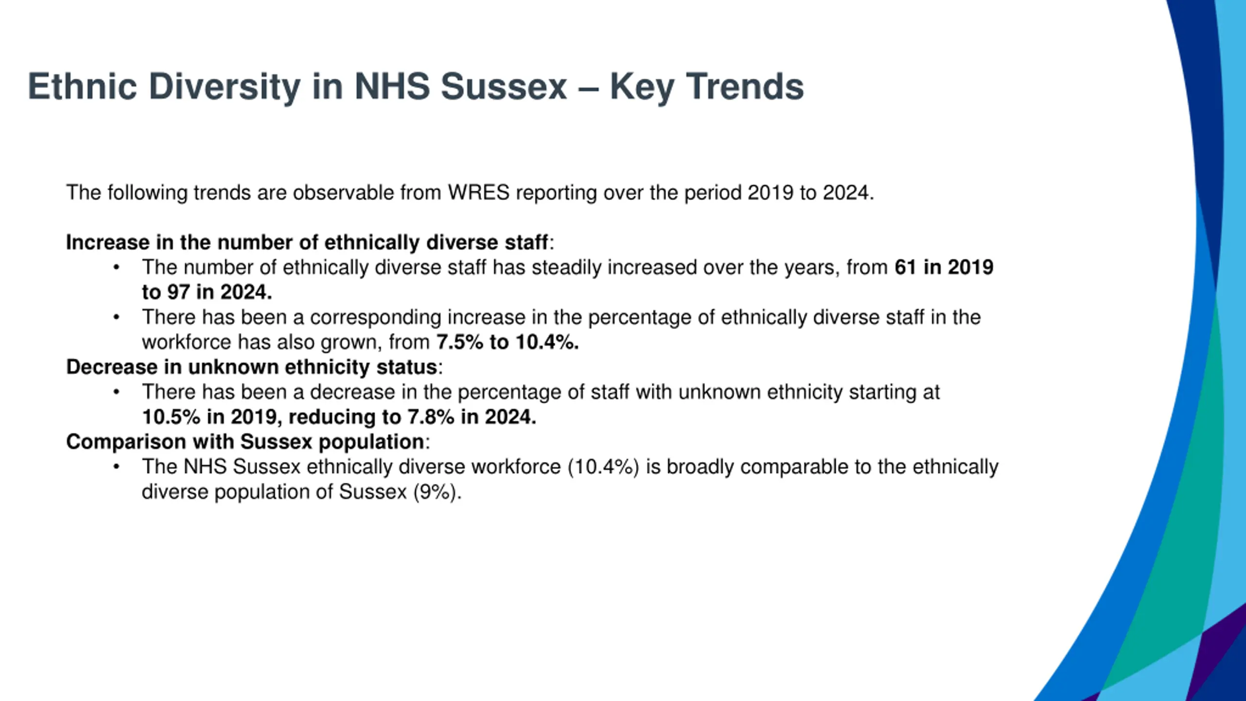 - Ethnic Diversity in NHS Sussex Key Trends The following trends are observable from WRES reporting over the period 2019 to 2024. Increase in the number of ethnically diverse staff: The number of ethnically diverse staff has steadily increased over the years, from 61 in 2019 to 97 in 2024. There has been a corresponding increase in the percentage of ethnically diverse staff in the workforce has also grown, from 7.5% to 10.4%. Decrease in unknown ethnicity status: There has been a decrease in the percentage of staff with unknown ethnicity starting at 10.5% in 2019, reducing to 7.8% in 2024. Comparison with Sussex population: The NHS Sussex ethnically diverse workforce (10.4%) is broadly comparable to the ethnically diverse population of Sussex (9%).